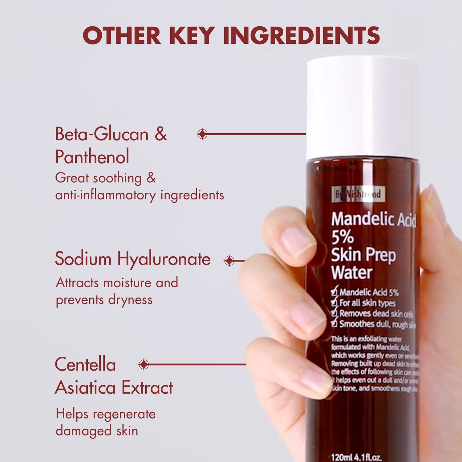 Water, Mandelic Acid, Butylene Glycol, Beta-Glucan, Panthenol, Glycyrrhiza Glabra (Licorice) Root Extract, Prunus Amygdalus Dulcis (Sweet Almond) Fruit Extract, Sodium Hyaluronate, Sorbitan Sesquioleate, Centella Asiatica Extract, Houttuynia Cordata Extract, Sorbitol, Dimethyl Sulfone, Chlorphenesin, Sodium Citrate, Arginine, PEG-60 Hydrogenated Castor Oil, Ethylhexylglycerin, Natto Gum, Carbome