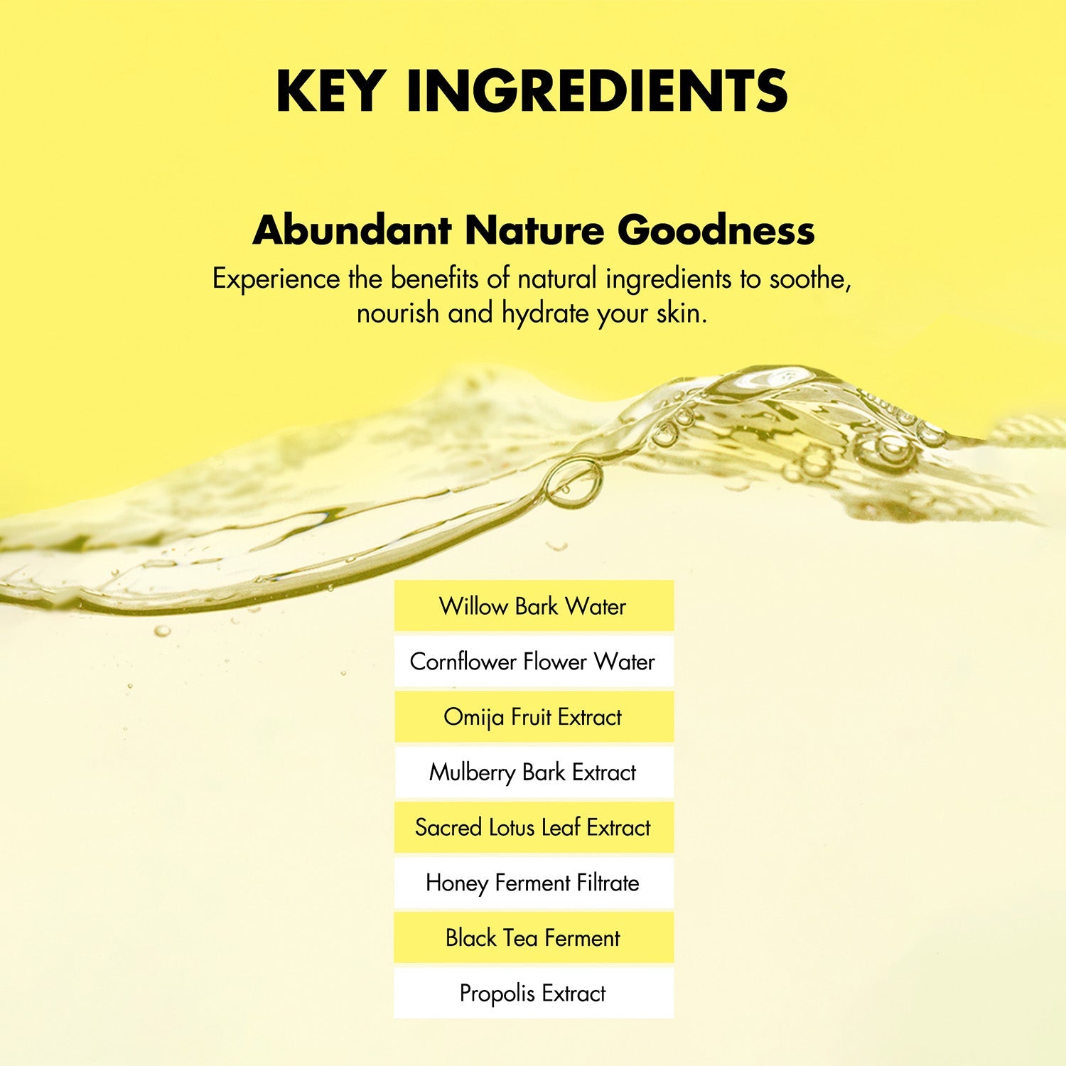 Aqua(Water), Salix Alba (Willow) Bark Extract(10%), Centaurea Cyanus Flower Water(9%), Schisandra Chinensis Fruit Extract(9%), Morus Alba Bark Extract(8.7%), Nelumbo Nucifera Leaf Extract(8.7%), Methylpropanediol, Glycerin, Saccharomyces/Honey Ferment Filtrate, Saccharomyces/Xylinum/Black Tea Ferment, 1,2-Hexanediol, Propolis Extract(1%), Butylene Glycol, Benzyl Glycol, Hydroxyethylcellulose, Citric Acid, Sodium Citrate, Disodium EDTA, Ethylhexylglycerin