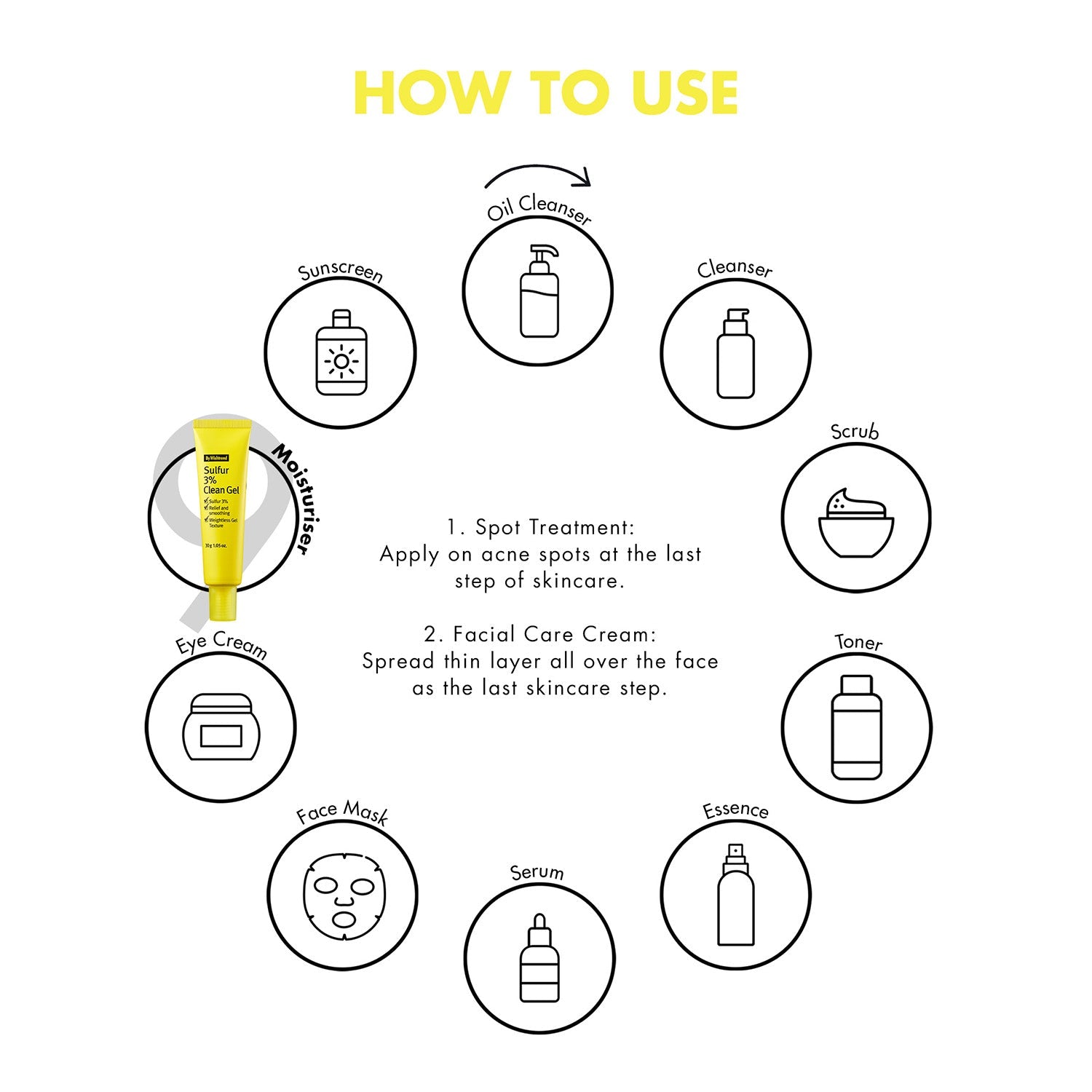 To use as a targeted acne treatment, apply the By Wishtrend Sulfur 3% Clean Gel directly to blemishes using a cotton swab. Leave on overnight for maximum effectiveness.