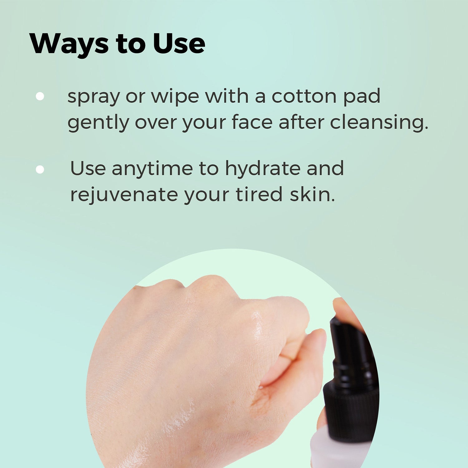 1. After cleansing, spray the toner onto a cotton pad and gently wipe it onto the face, avoiding the eye and mouth area.
