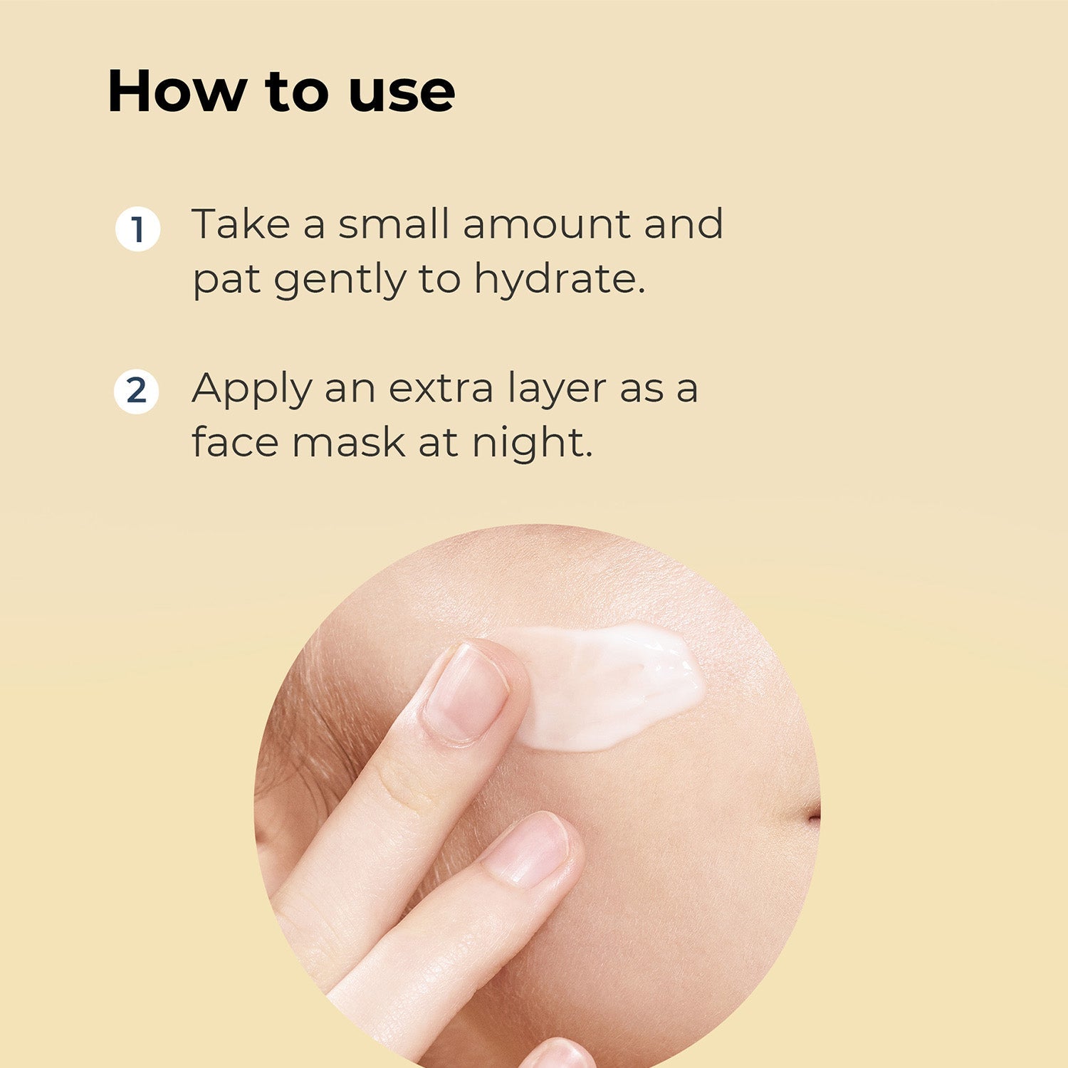 1. Gently apply a proper amount of the cream to face, avoiding the eye and mouth area, after cleansing and toning.