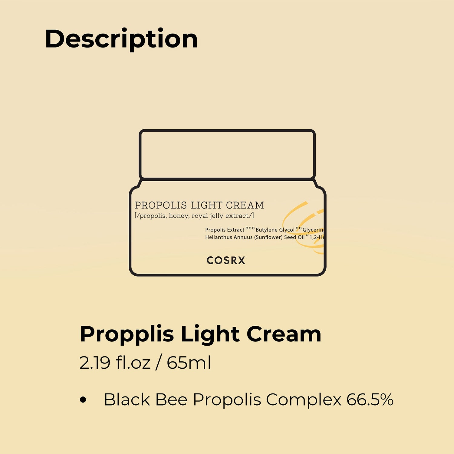 The Cosrx Full Fit Propolis Light Cream is infused with a special Full Fit Pro Complex that uses Propolis to enhance the skin's natural glow. It is a deeply moisturising cream with a lightweight gel texture that absorbs quickly without feeling greasy.