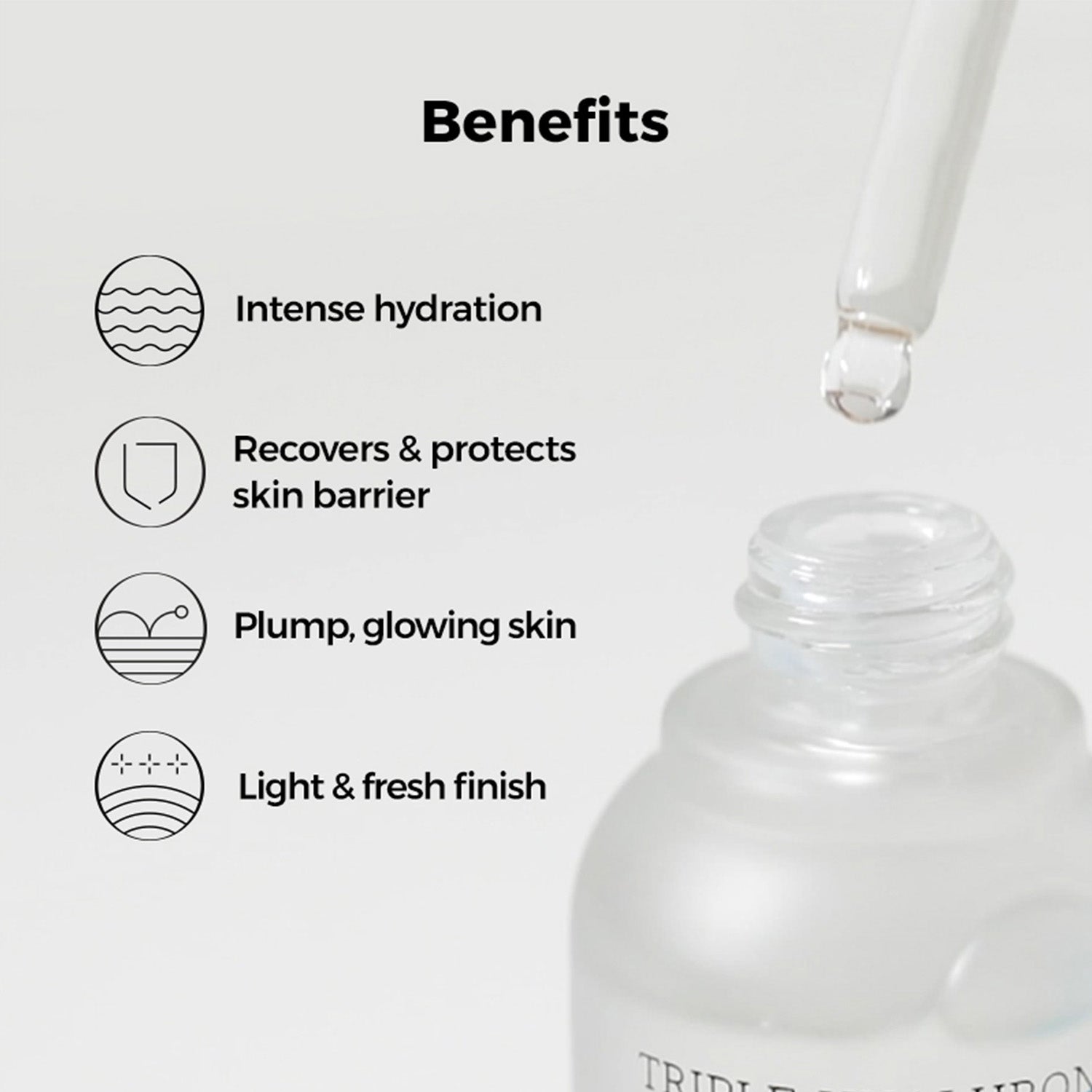 - Triple Hyaluronic Acid: Keeps skin well moisturised and hydrated and forms a protective barrier to prevent moisture loss.