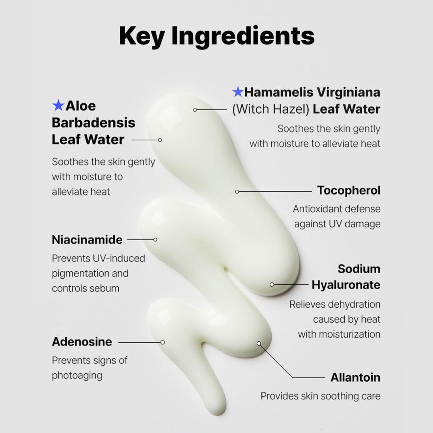 Aloe Barbadensis Leaf Water, Diethylhexyl Succinate, Propanediol, Aqua/Water, Drometrizole Trisiloxane, Ethylhexyl Triazone, Niacinamide, Diethylamino Hydroxybenzoyl Hexyl Benzoate, Terephthalylidene Dicamphor Sulfonic Acid, 1,2-Hexanediol, Behenyl Alcohol, Methyl Trimethicone, Sodium Polyacryloyldimethyl Taurate, Hamamelis Virginiana (Witch Hazel) Leaf Water, Tromethamine, Polyacrylate Crosspolymer-6, Arachidyl Alcohol, Caprylyl Glycol, Ethylhexylglycerin, Arachidyl Glucoside, Sodium Metaphosphate, Adenosine, Tocopherol, Sodium Hyaluronate, Allantoin, Citric Acid, Sodium Benzoate, Potassium Sorbate