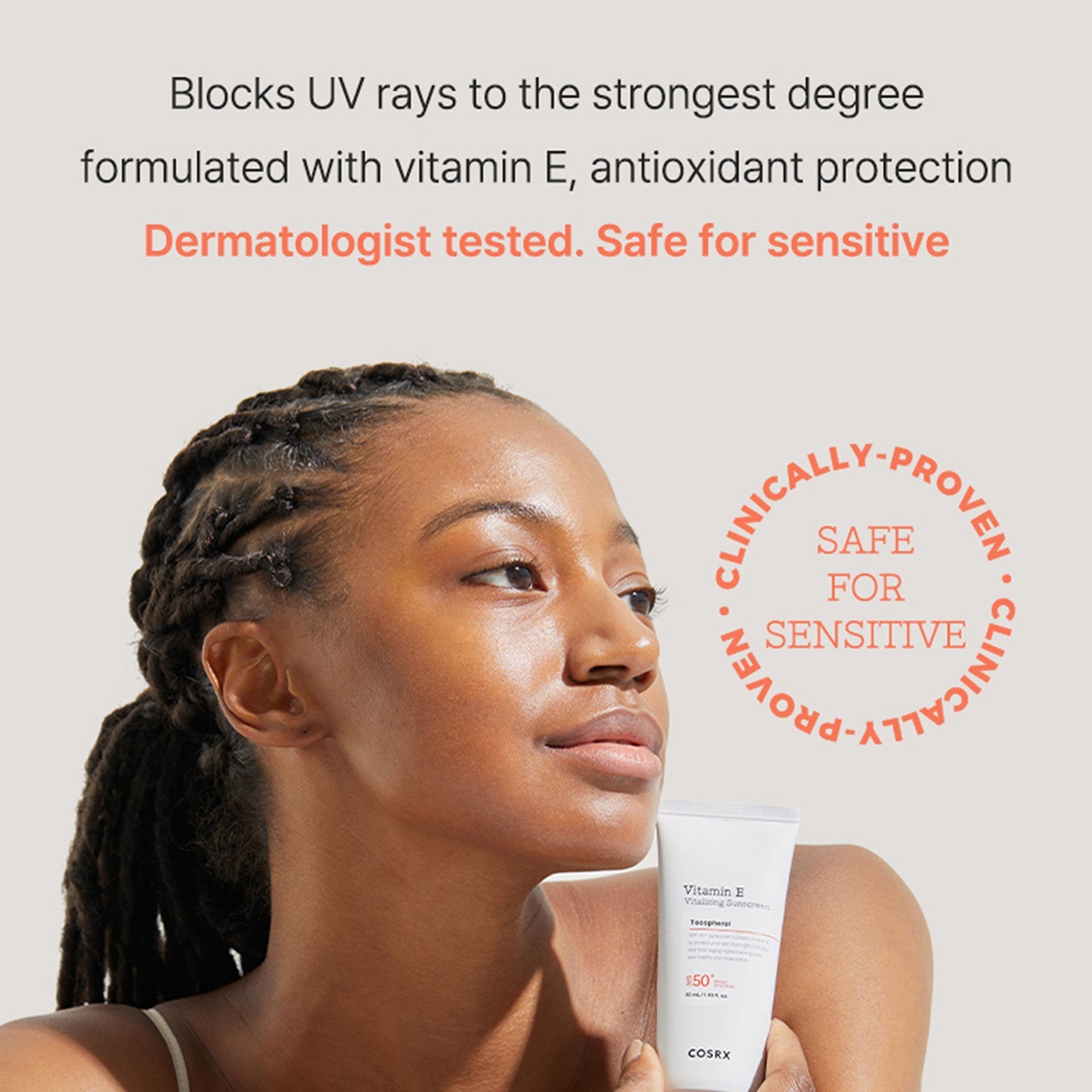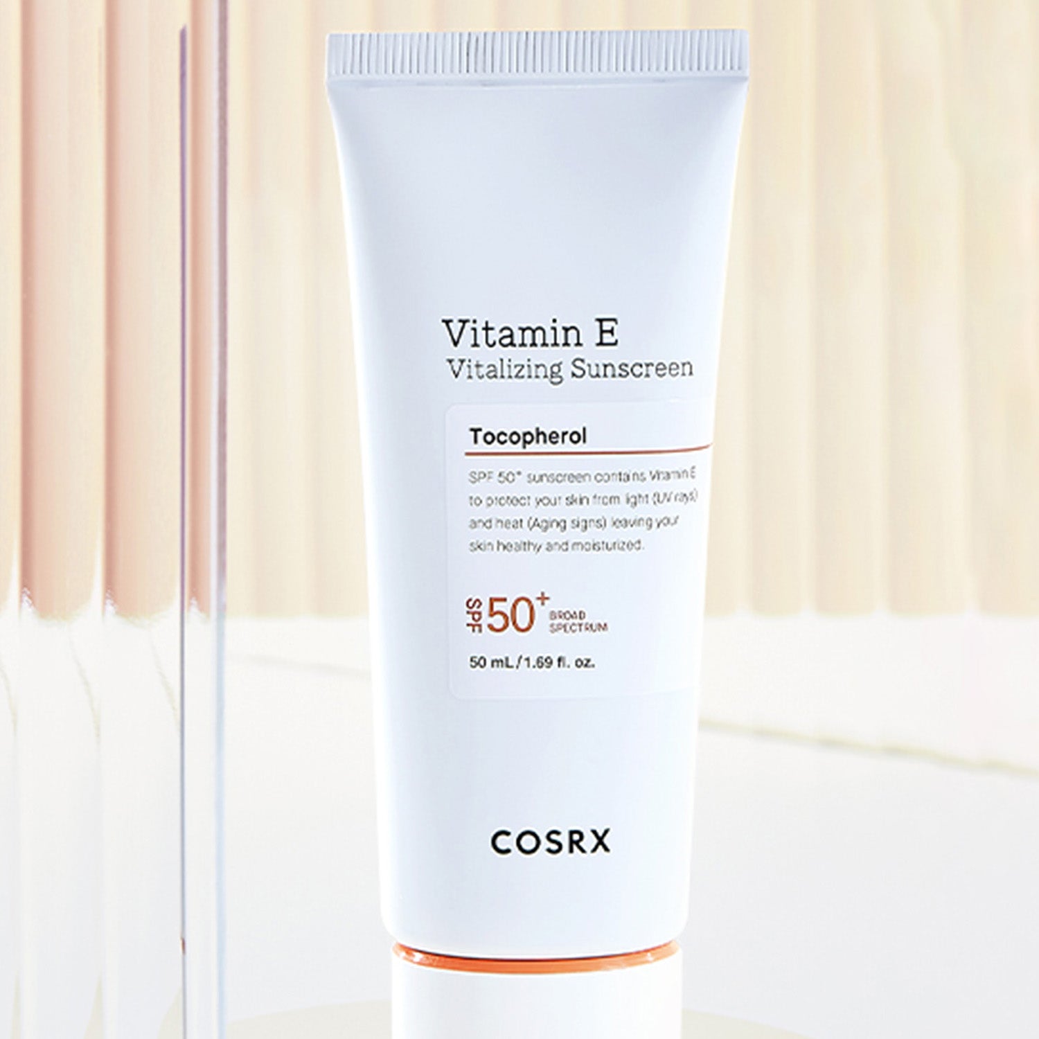 The Cosrx Vitamin E Vitalizing Sunscreen is a Korean sunscreen with SPF 50+ that protects the skin from UV damage and is formulated with vitamin E for added protection. It is a daily use sunscreen that also helps control excess sebum production. The lotion-like formula is non-greasy and quickly absorbs into your skin with no white cast.