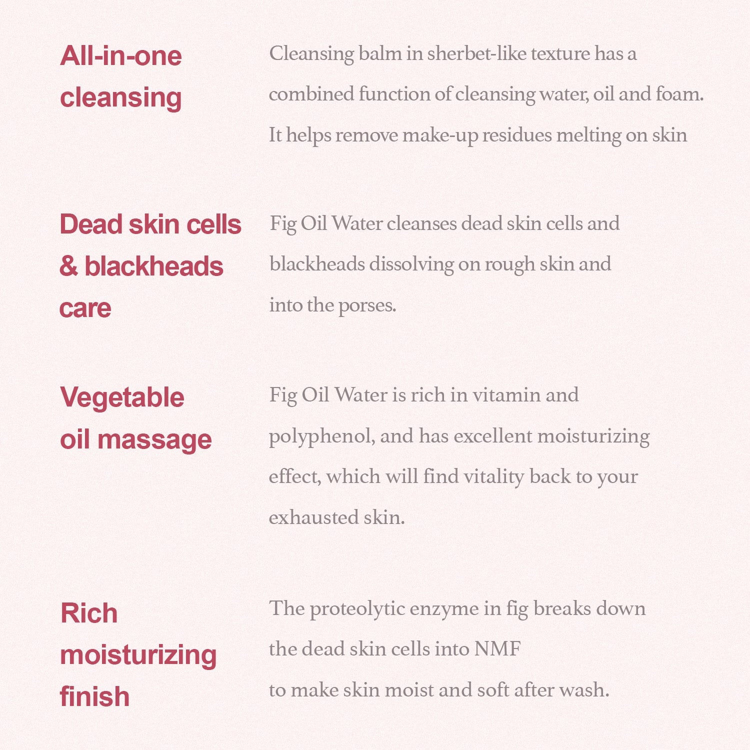 Hydrating, deep cleansing balm has rich moisturizing finish. The proteolytic enzyme in fig breaks down the dead skin cells into NMF to make skin moist and soft after wash.