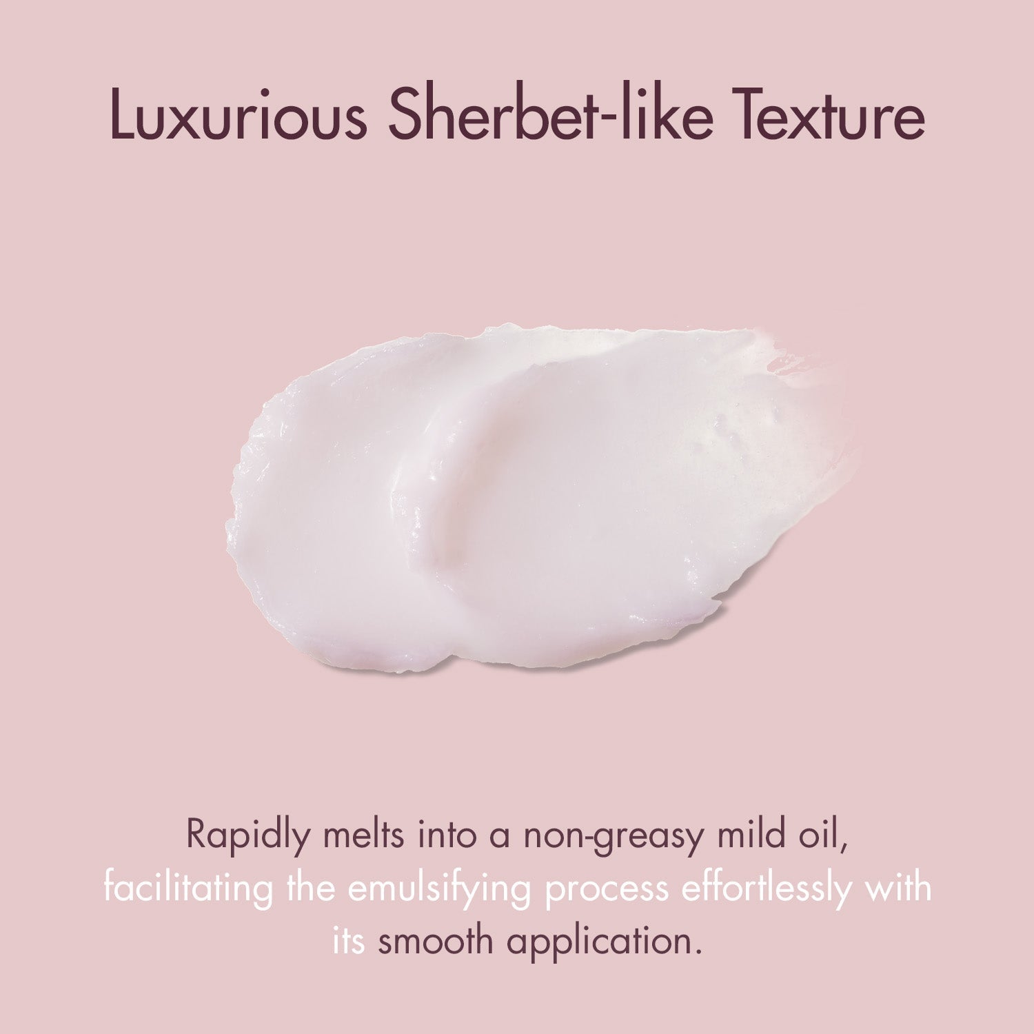 Soft sherbet-like texture in light pink color that leaves skin feeling refreshed. The cleansing balm has a combined function of cleansing water, oil and foam. It helps remove waterproof makeup, sunscreen and residue as it dissolves on the skin.
