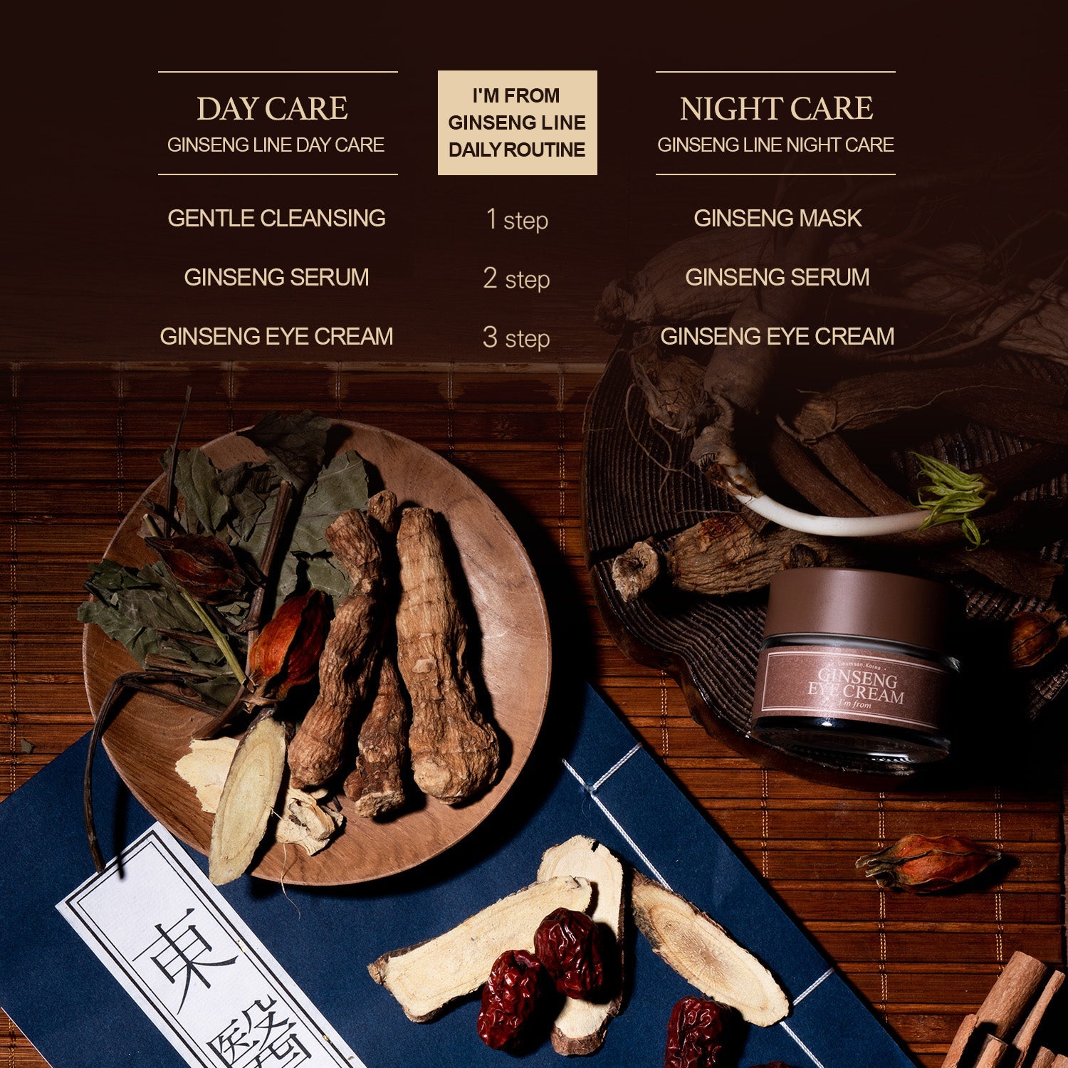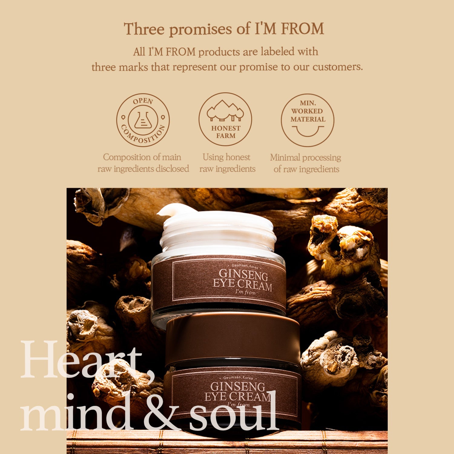 Discover the power of nature with I'm From Ginseng Eye Cream. This luxurious eye cream is formulated with three types of rare ginseng, locally sourced from Geumsan, Korea, to provide targeted nourishment and revitalize tired eyes. The cream contains 3.65% of 6-year-old red ginseng - the purest concentrated essence of the best red ginseng.