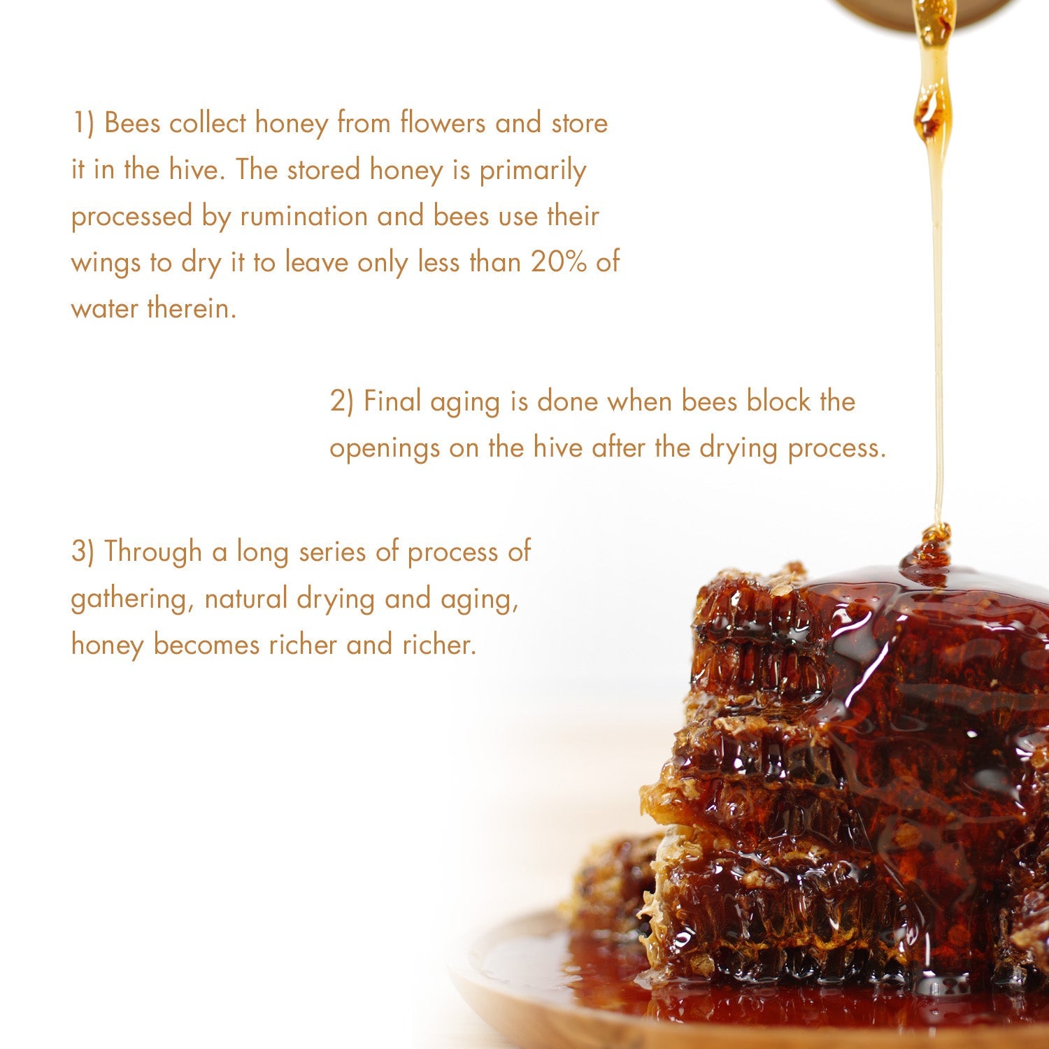 • Honey: Honey (Jiri Mountain Honey): Contains Jiri Mountain honey with rich flavor and scent. Pure unprocessed honey, which contains 70% of glucose, is used to present excellent moisturizing power.