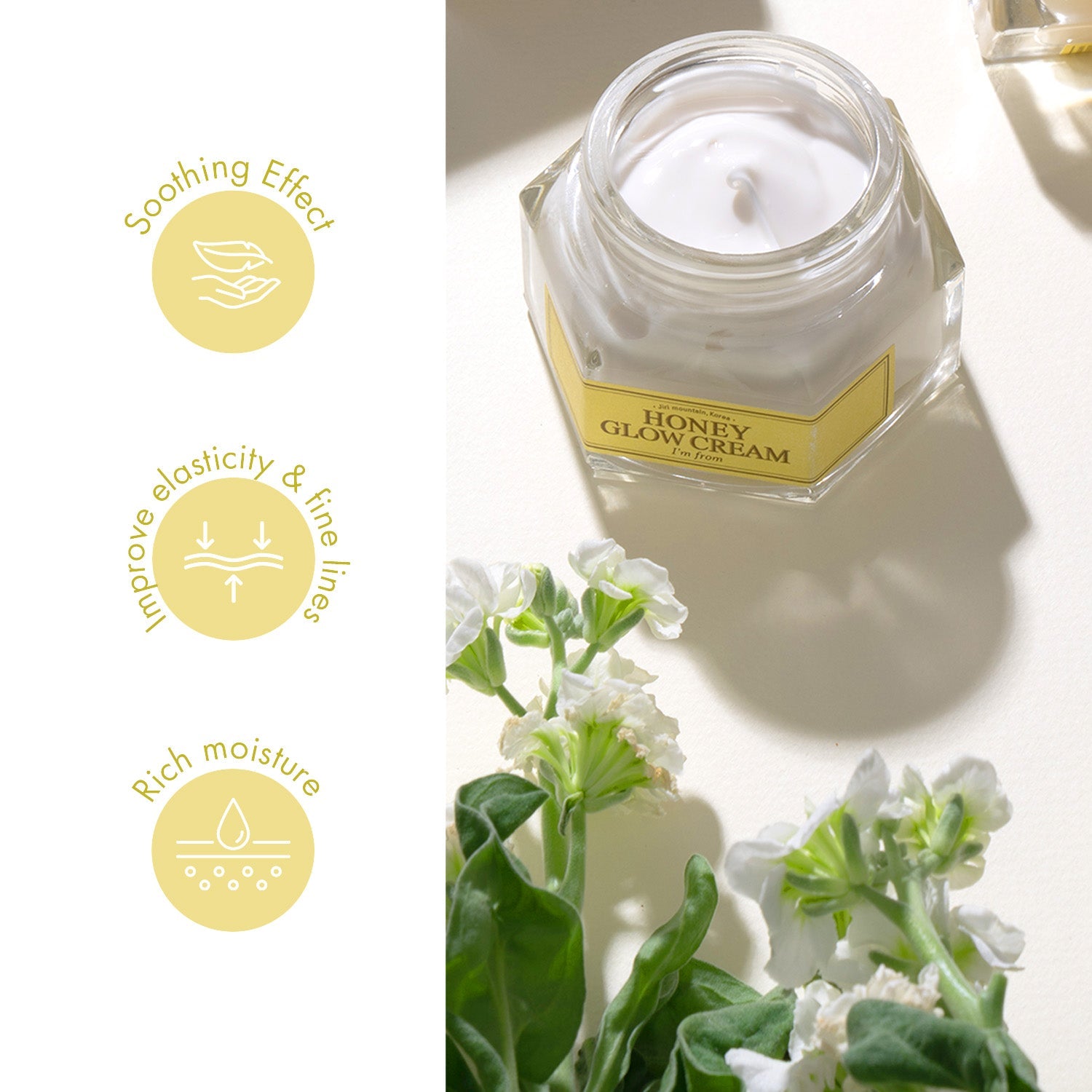 Discover the transformative power of I'm From Honey Glow Cream, a luxurious moisturizer infused with I'm From's unique Honey Glow Queen™ complex. This potent blend of seven active ingredients, including honey, black bee propolis, royal jelly, bee venom, turmeric, bee pollen, and cinnamon, provides deep nourishment and hydration to distressed skin.