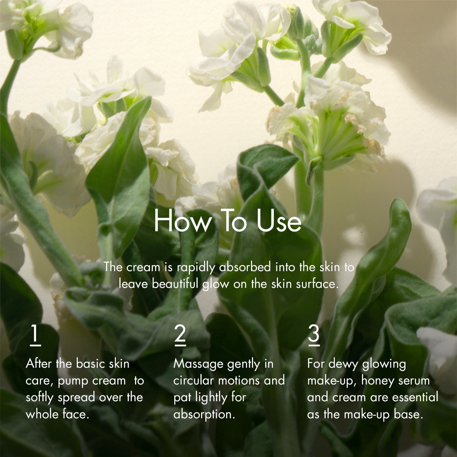 Enriched with 30.63% Honey Glow Queen™, this cream delivers a rich dose of essential nutrients, including sugar, protein, minerals, vitamin B derivatives, and amino acids. The result is a revitalized, radiant complexion that is deeply moisturized and nourished.