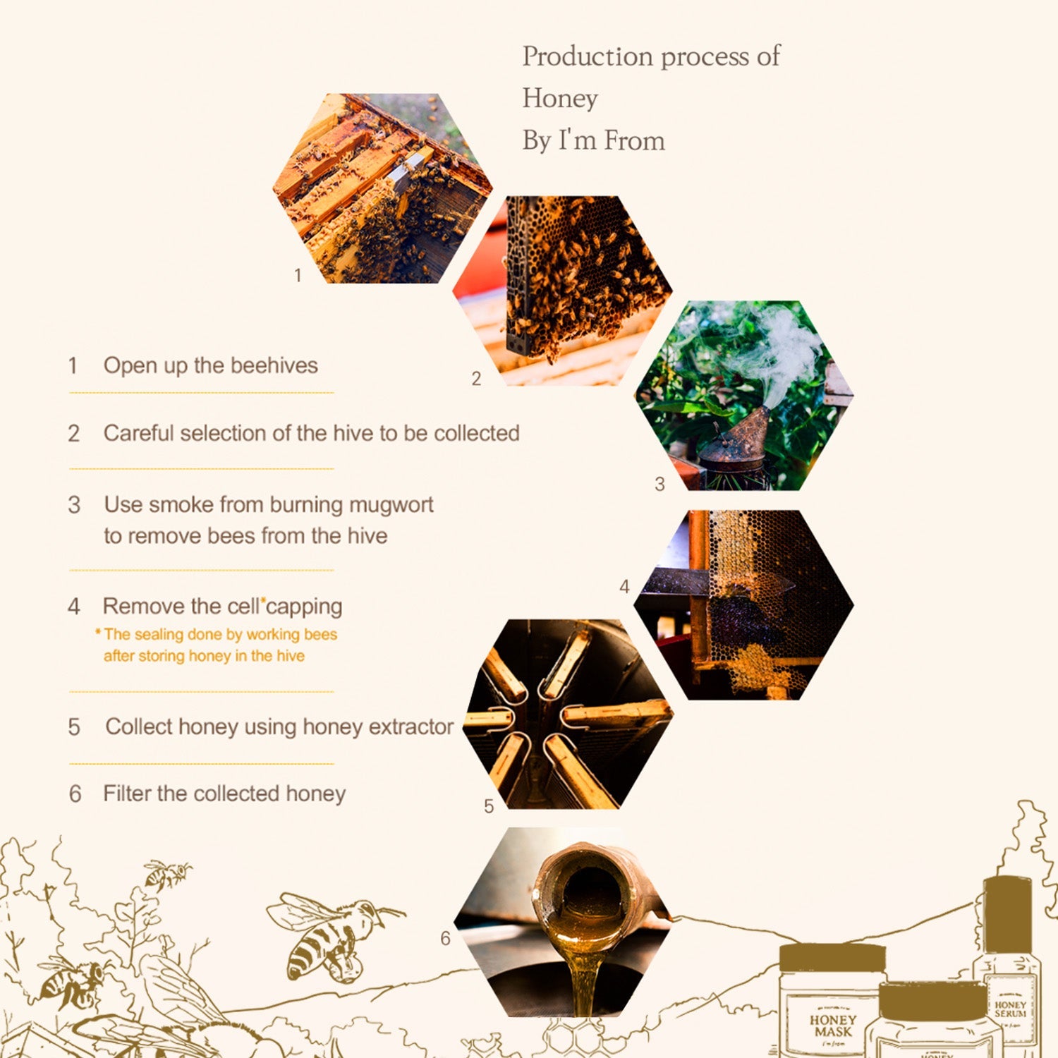 Discover the transformative power of I'm From Honey Serum, a luxurious, deeply hydrating serum infused with I'm From's unique Honey Glow Queen™ complex. Sourced from the pristine Jiri Mountain, Korea, this product is crafted with the finest, locally sourced natural ingredients. This potent blend of seven active ingredients, including honey, black bee propolis, royal jelly, bee venom, turmeric, bee pollen, and cinnamon, provides deep nourishment and hydration to distressed skin.