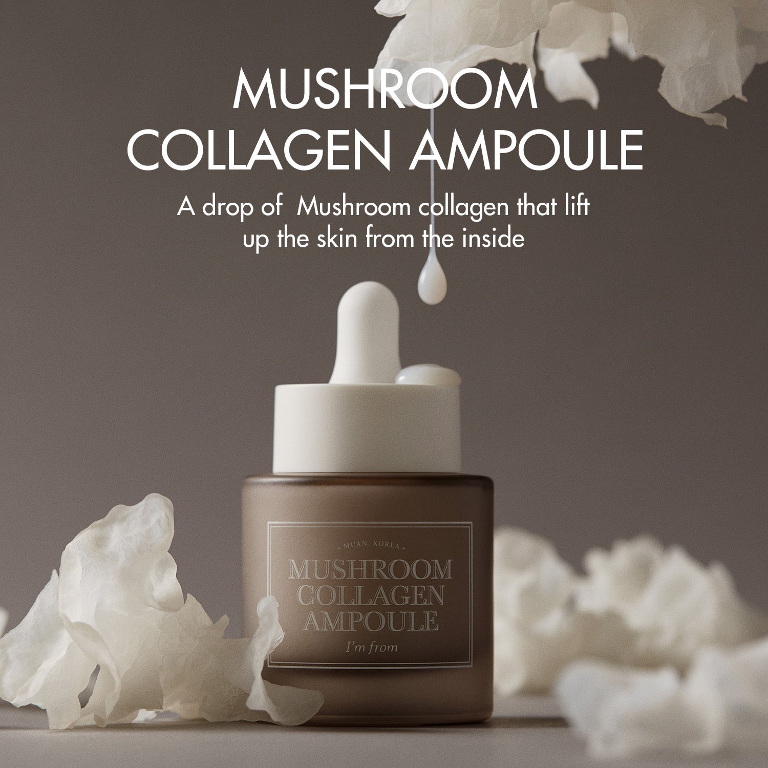 The I'm From Mushroom Collagen Ampoule, a plant-based collagen serum designed to nourish and revitalize aging skin. Infused with 20% Tremella Fuciformis extract, sourced locally from Muan, Korea - this innovative formula provides a potent dose of collagen, essential for maintaining skin firmness and elasticity.