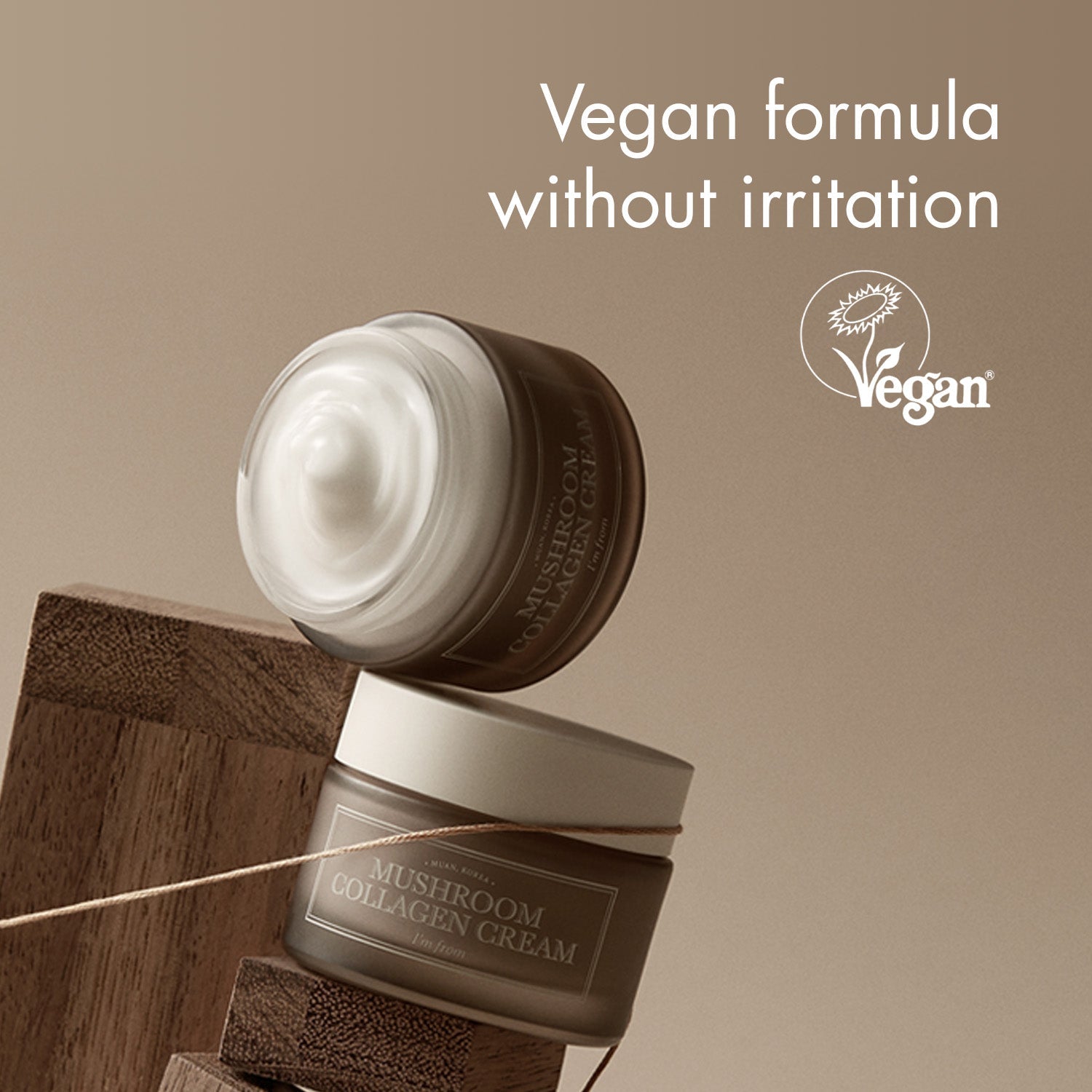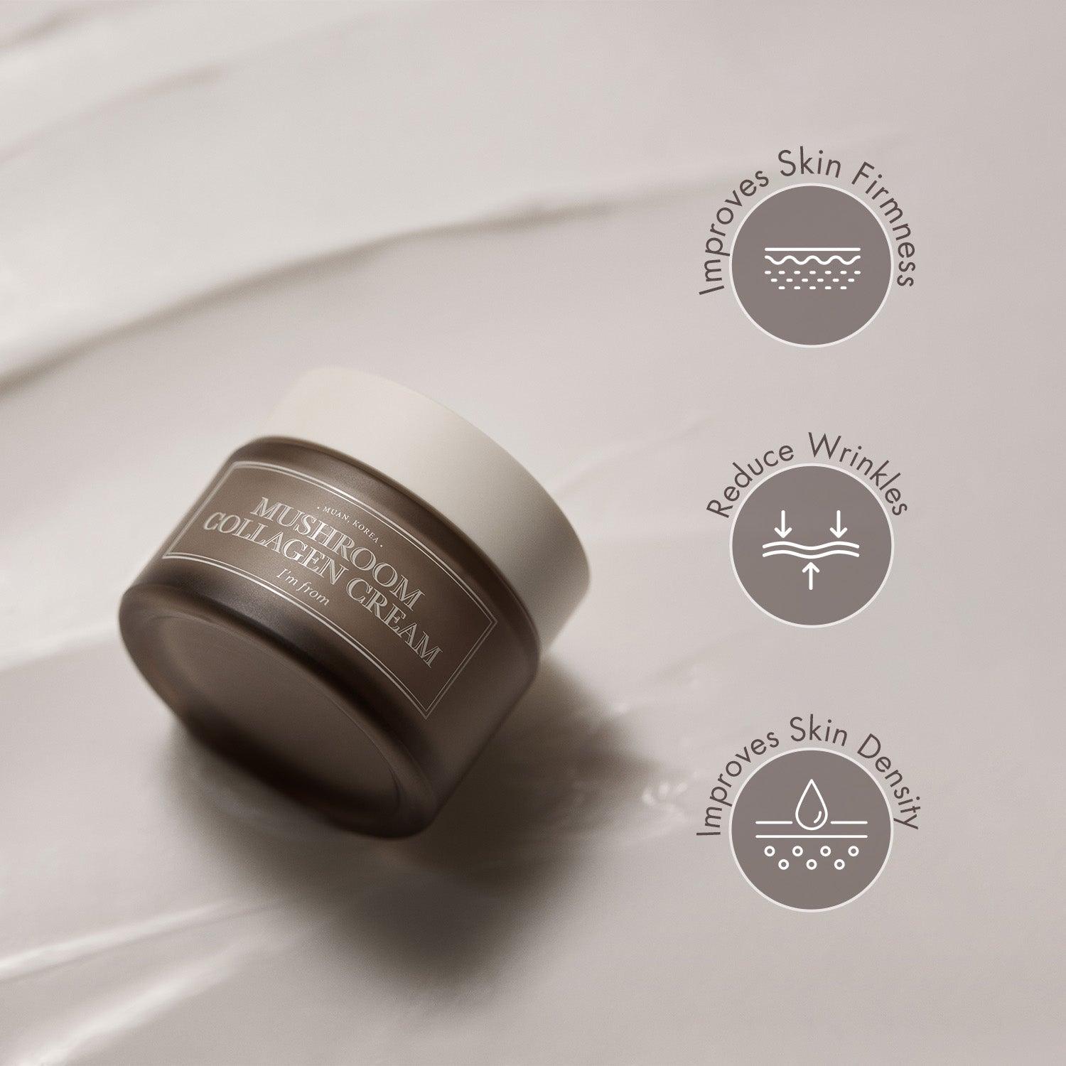 I'm From's Mushroom Collagen Cream is a source of vegan collagen, obtained from Tremella Fuciformis, locally sourced from Muan, Korea. It is also known as plant-based hyaluronic acid as it provides a high concentration of moisture.The Mushroom Collagen Cream's rich, gooey texture deeply hydrates and lifts the skin, filling in sagging and drooping areas and reducing the appearance of fine wrinkles.