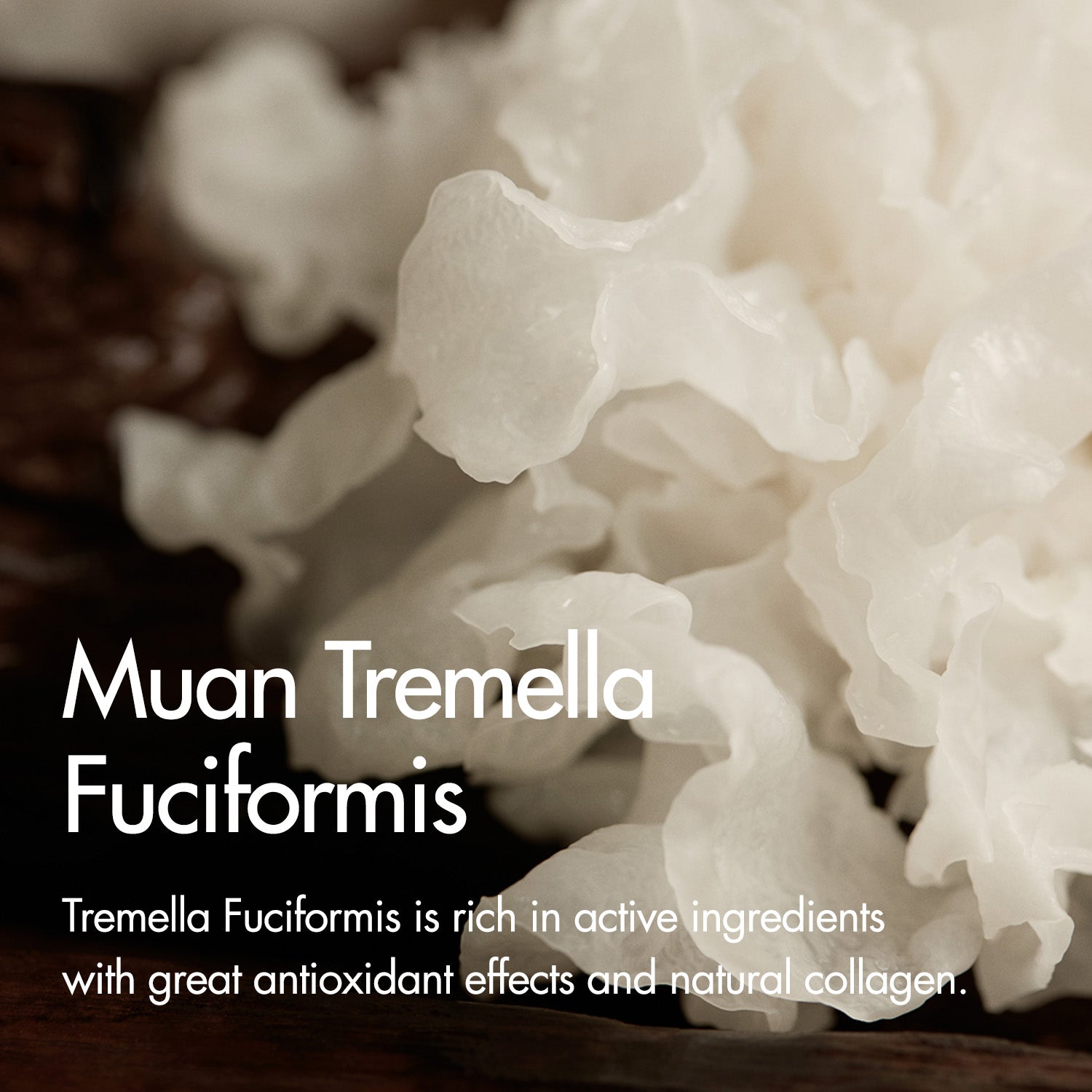 Mushroom Extract: Tremella Fuciformis (30%).This product contains vegan collagen fully obtained from the nature-derived collagen Tremella Fuciformis using the PHYTO-ACTIVE ™ high concentration extraction method.
