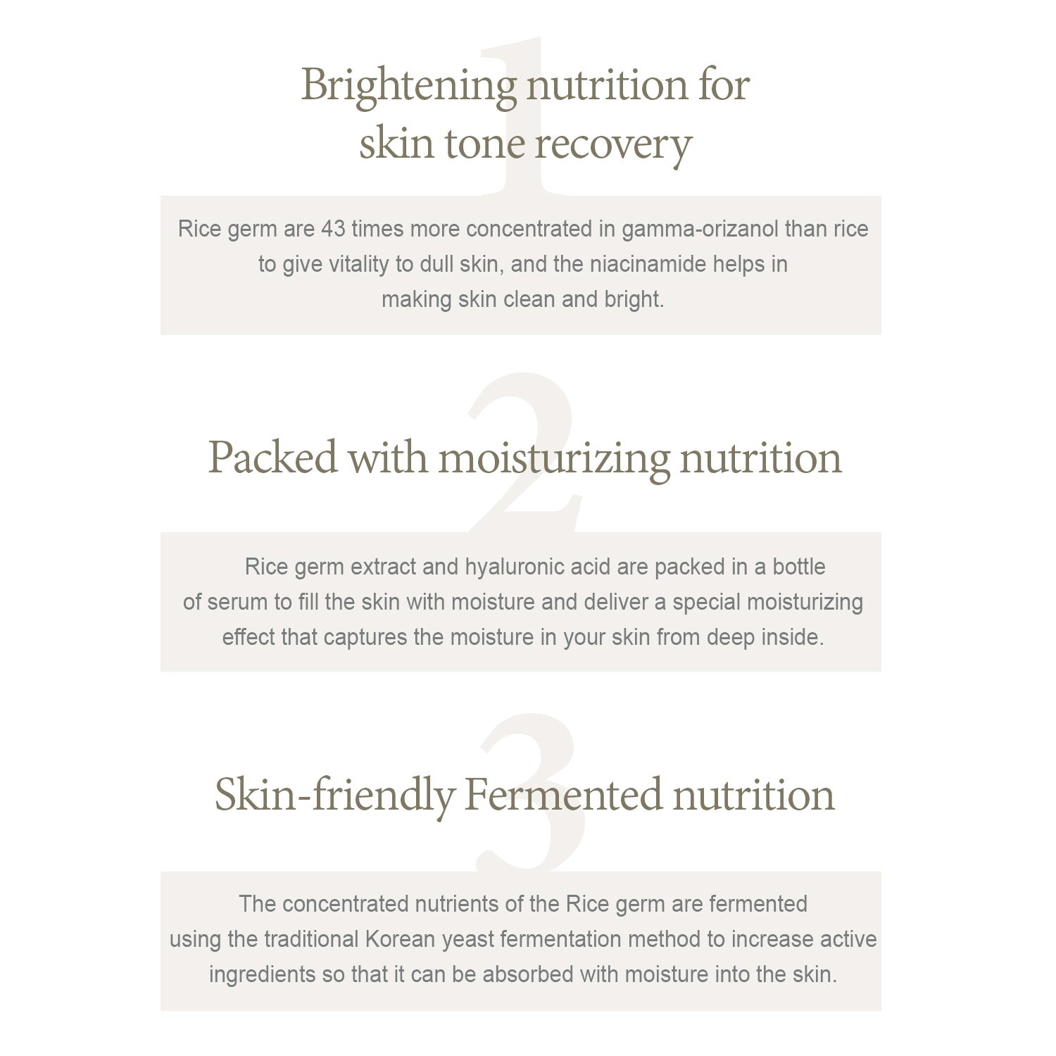 Rice germ extract, squalane, panthenol and hyaluronic acid are packed in this bottle of serum to fill your skin with moisture, and deliver a special moisturising effect that locks-in the moisture in your skin. The serum also uses Niacinamide to boost the brightening and skin-firming benefits of rice - for healthy, glowing skin.
