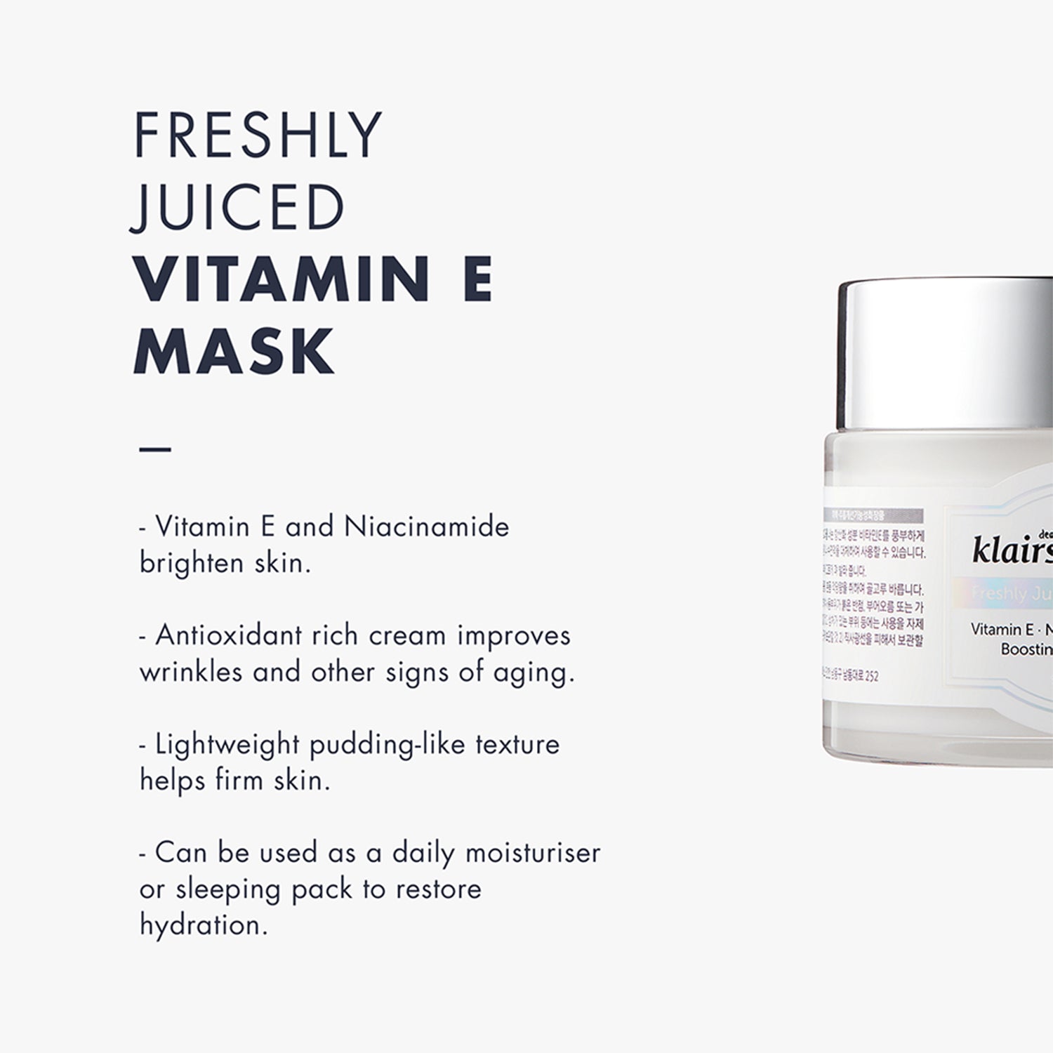 The Klairs Vitamin E Mask is a multifunctional cream that can be used as a mask, a thick sleeping pack or as a daily moisturiser. Formulated with Vitamin E, it delivers antioxidant benefits that brighten the skin, improves wrinkles and reduces signs of ageing. Its lightweight, pudding or jelly-like texture allows it to be easily absorbed into the skin leaving it feeling supple and fresh, without feeling sticky.