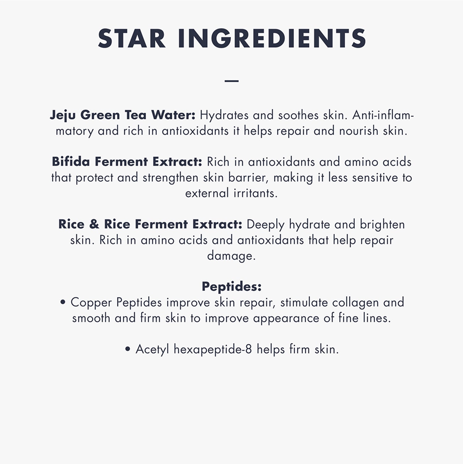 Aqua(Water), Glycerin, Butylene Glycol, Camellia Sinensis Leaf Water, Oryza Sativa (Rice) Extract, Bifida Ferment Extract, Betaine, Dipropylene Glycol, Sorbitol, 1,2-Hexanediol, Aspergillus/Rice Ferment Extract, Camellia Sinensis Leaf Extract, Dipotassium Glycyrrhizate, Sorbitan Sesquioleate, Ethylhexylglycerin, Sodium Acrylate/Sodium Acryloyldimethyl Taurate Copolymer, Sodium Hyaluronate, Hydroxyethylcellulose, Xanthan Gum, Arginine, Carbomer, Tocopheryl Acetate, Acrylates/C10-30 Alkyl Acrylate Crosspolymer, Laminaria Japonica Extract, Ceramide NP, Hydrogenated Lecithin, Copper Tripeptide-1, Acetyl Hexapeptide-8