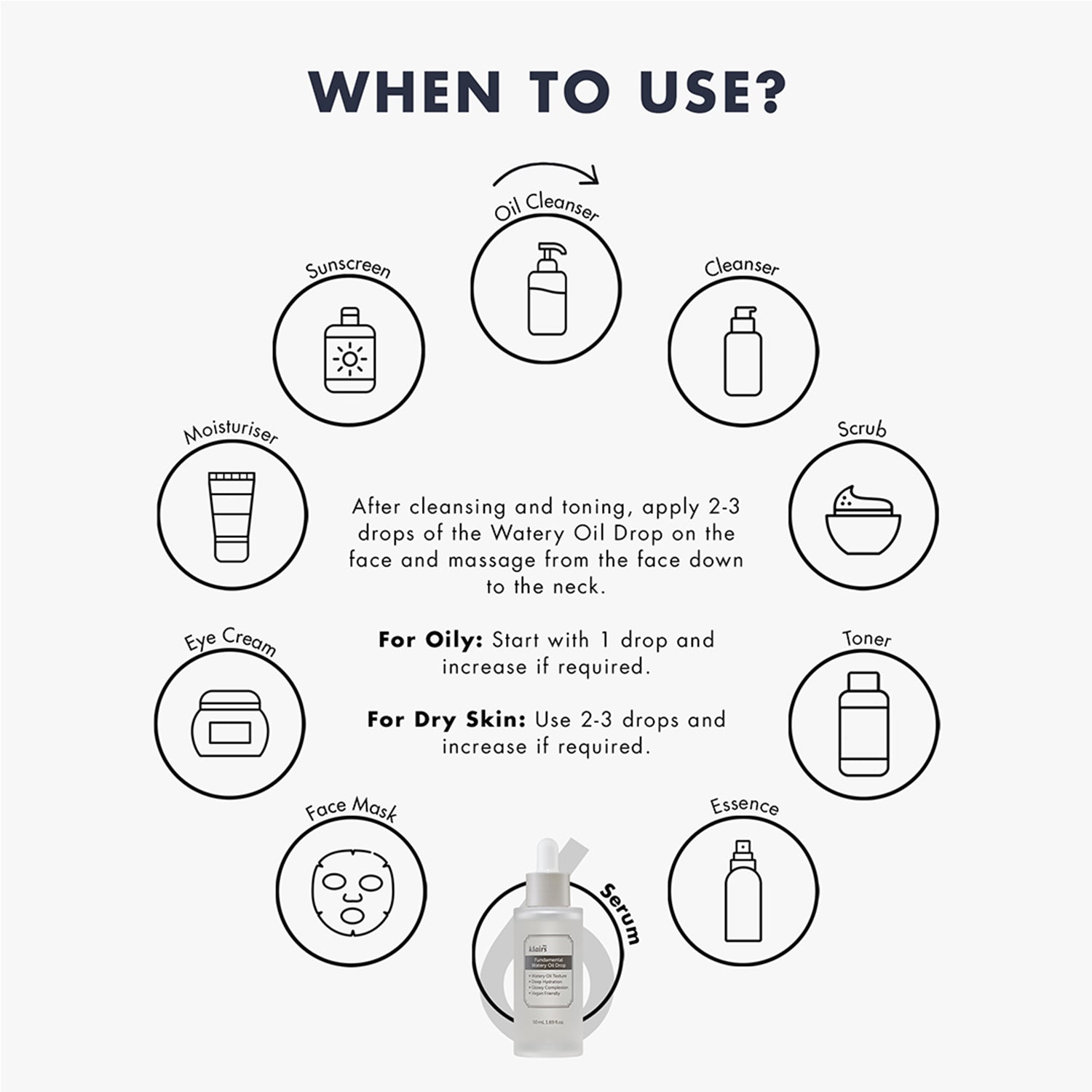 After cleansing and toning, apply 2-3 drops of the Watery Oil Drop on the face and massage from the face down to the neck.