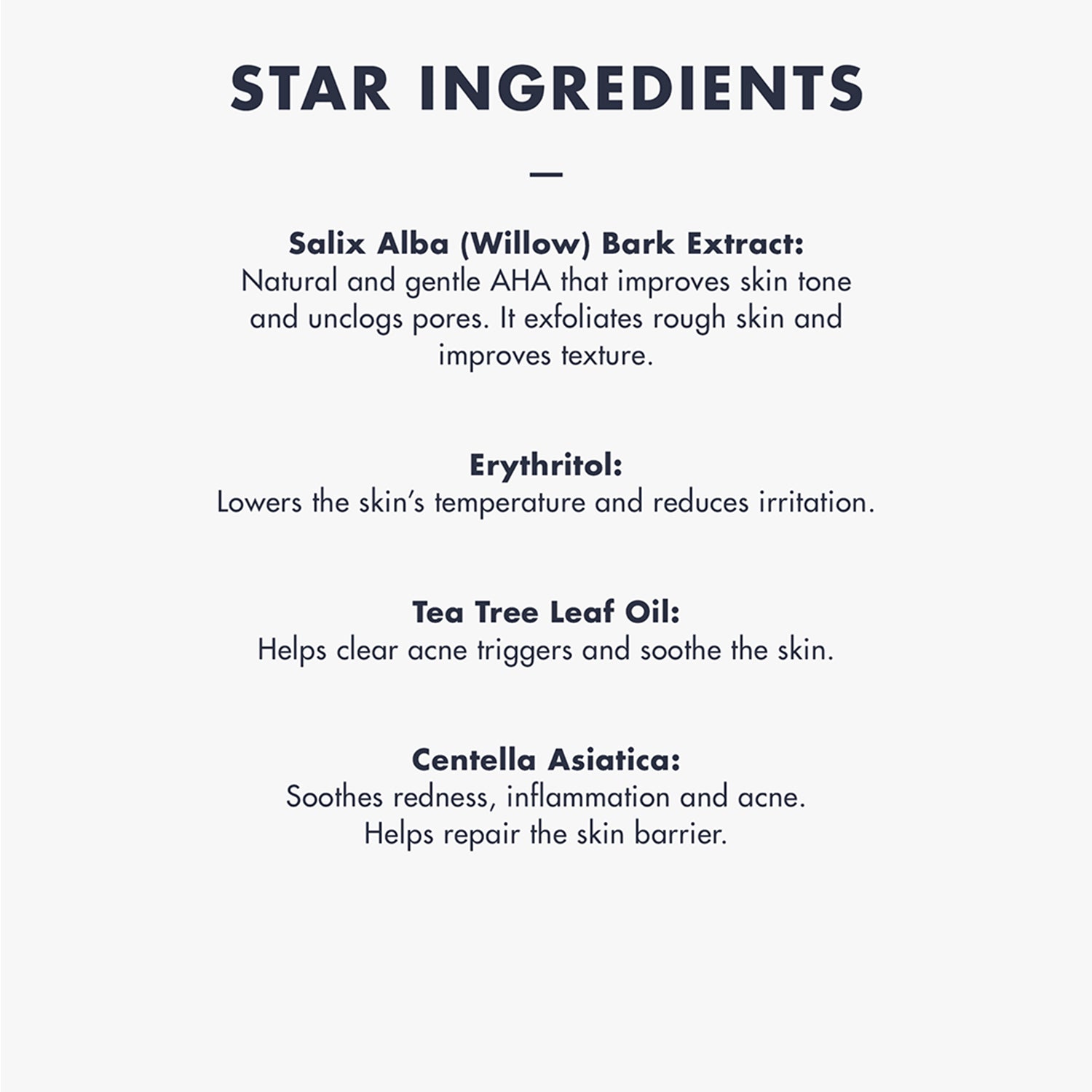 Water, Butylene Glycol, Methylpropanediol, Glycereth-26, 1,2-Hexanediol, Salix Alba (Willow) Bark Extract, Glycerin, Erythritol, Arginine, Carbomer, Carrageenan, Betaine, Allantoin, Ethylhexylglycerin, Propanediol, Polyglyceryl-10 Laurate, Glyceryl Acrylate/Acrylic Acid Copolymer, PVM/MA Copolymer, Disodium EDTA, Dipotassium Glycyrrhizate, Melaleuca Alternifolia (Tea Tree) Leaf Oil, Centella Asiatica Extract