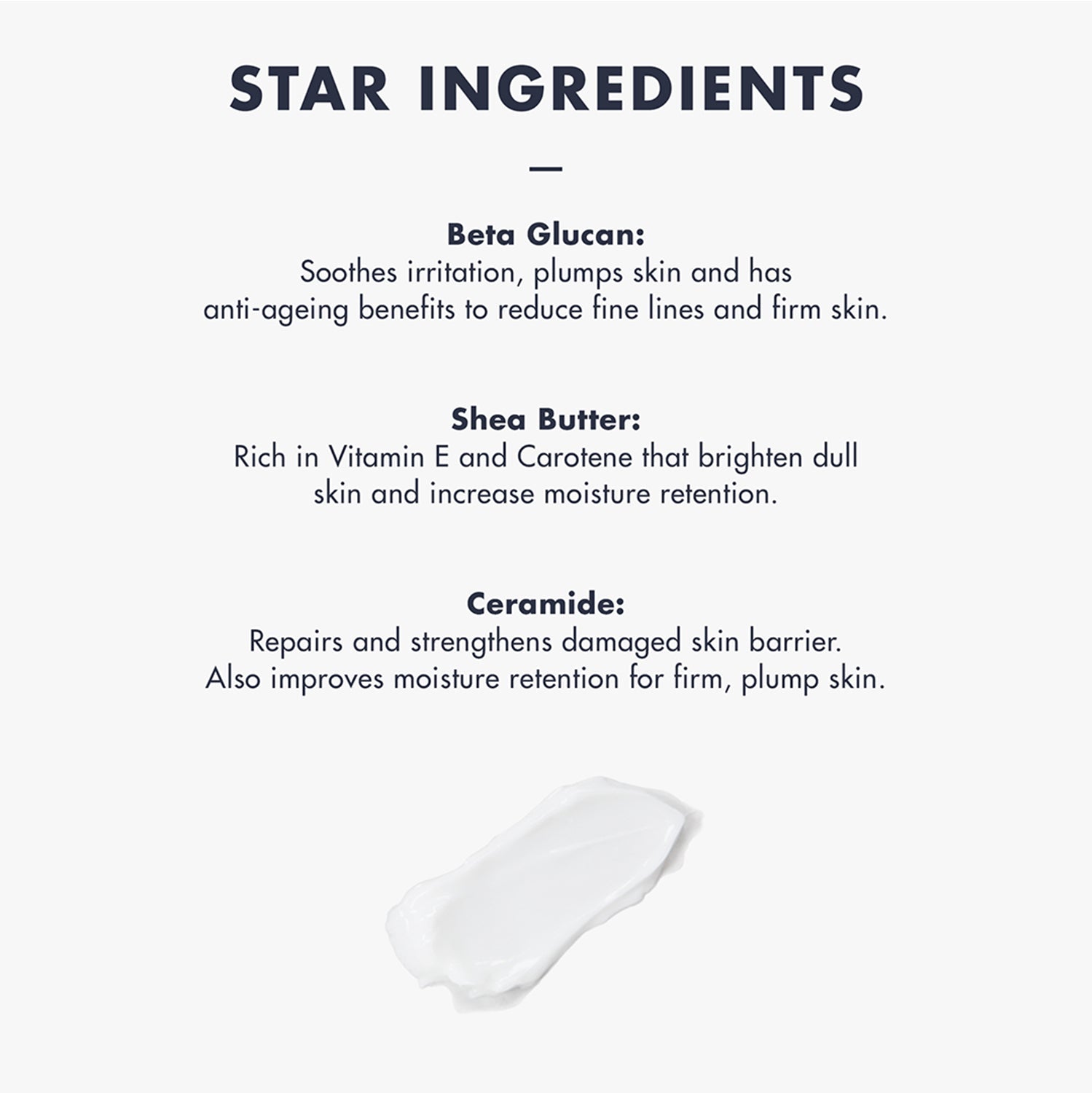 Water, Glycerin, Caprylic/Capric Triglyceride, Cyclopentasiloxane, Cetyl Alcohol, Glyceryl Stearate, Cetyl Ethylhexanoate, Butyrospermum Parkii (Shea) Butter, Simmondsia Chinensis (Jojoba) Seed Oil, Stearic Acid, Butylene Glycol, Sorbitan Sesquioleate, Microcrystalline Wax, Betaine, Sorbitan Stearate, PEG-100 Stearate, Dimethicone, Arginine, Carbomer, Chlorphenesin, Tocopheryl Acetate, Paeonia Suffruticosa Root Extract, Illicium Verum (Anise) Fruit Extract, Nelumbium Speciosum Flower Extract, Citrus Paradisi (Grapefruit) Fruit Extract, Scutellaria Baicalensis Root Extract, Citric Acid, Beta-Glucan, Hydrogenated Lecithin, Portulaca Oleracea Extract, 1,2-Hexanediol, Centella Asiatica Extract, Aloe Barbadensis Leaf Extract, Althaea Rosea Flower Extract, Sodium Hyaluronate, Ceramide NP, Disodium EDTA, Polyquaternium-51, Apium Graveolens (Celery) Extract, Brassica Rapa (Turnip) Leaf Extract, Oryza Sativa (Rice) Bran Extract, Brassica Oleracea Capitata (Cabbage) Leaf Extract, Disodium Adenosine Triphosphate, Daucus Carota Sativa (Carrot) Root Extract, Brassica Oleracea Italica (Broccoli) Extract, Solanum Lycopersicum (Tomato) Fruit/Leaf/Stem Extract, Lysine HCl, Sodium Ascorbyl Phosphate, Acetyl Methionine, Theanine, Proline, Palmitic Acid, Arachidic Acid, Oleic Acid, Sodium Hydroxide, Algin, Carica Papaya (Papaya) Fruit Extract, Natto Gum, Citrus Limon (Lemon) Peel Oil, Lavandula Angustifolia (Lavender) Oil, Citrus Aurantium Dulcis (Orange) Peel Oil, Pelargonium Graveolens Flower Oil, Cananga Odorata Flower Oil, Eucalyptus Globulus Leaf Oil