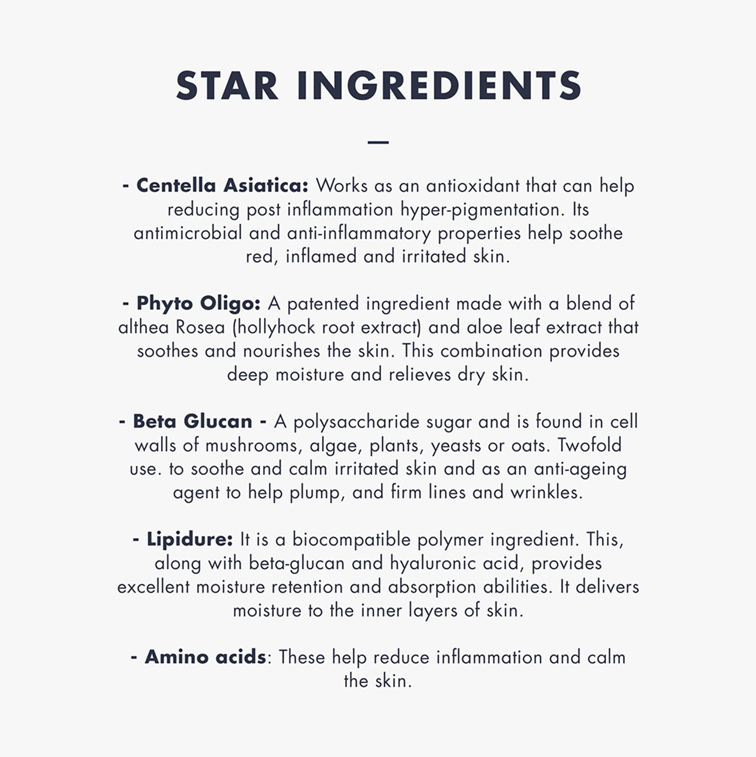 - Lipidure: It is a biocompatible polymer ingredient. This, along with beta-glucan and hyaluronic acid, provides excellent moisture retention and absorption abilities. It delivers moisture to the inner layers of skin.