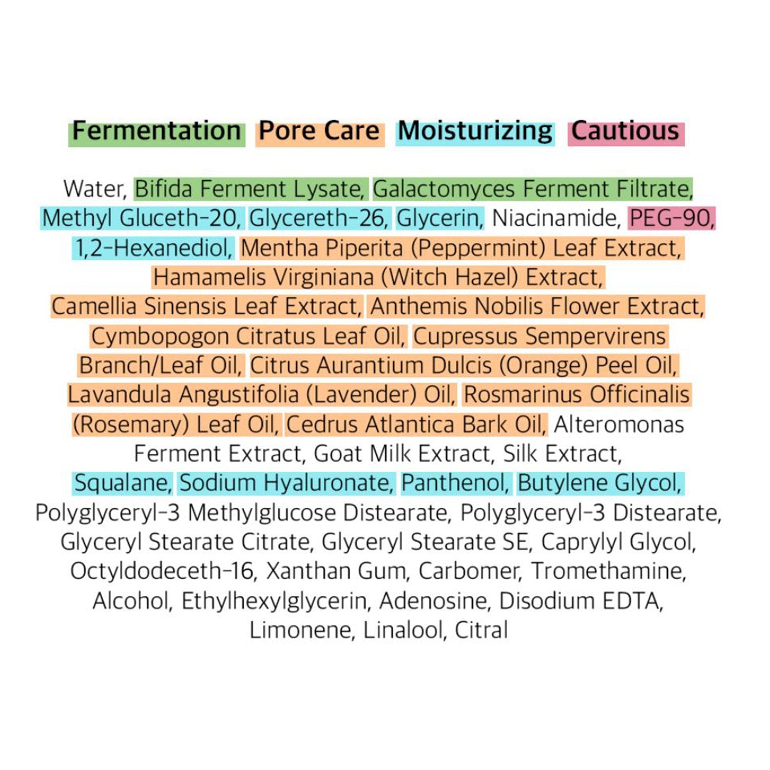 Water, Bifida Fermentation Lysate (20%), Galactomyces Fermentation Filtrate (9%), Methylgluces-20, Glyceres-26, Glycerin, Niacinamide, PEG-90, 1,2-Hexanediol, Peppermint Leaf Extract, Virginia Foliage Extract, Green Tea Extract, Chamomile Flower Extract, Lemongrass Leaf Oil, Pine Pine Branch/Leaf Oil, Orange Bark Oil, Lavender Oil, Rosemary Leaf Oil, Atlas Cedar Bark Oil, Alteromonas Fermentation Extract , Chlorine Oil Extract, Silk Extract, Squalane, Sodium Hyaluronate, Panthenol, Butylene Glycol, Polyglyceryl-3 Methyl Glucose Distearate, Polyglyceryl-3 Distearate, Glyceryl Stearate Citrate, Glyceryl Stearate Se, Caprylyl Glycol, Octyldodeces-16, Xanthan Gum, Carbomer, Tromethamine, Ethanol, Ethylhexyl Glycerin, Adenosine, Disodium Idta, Limonene, Linalool, Citral