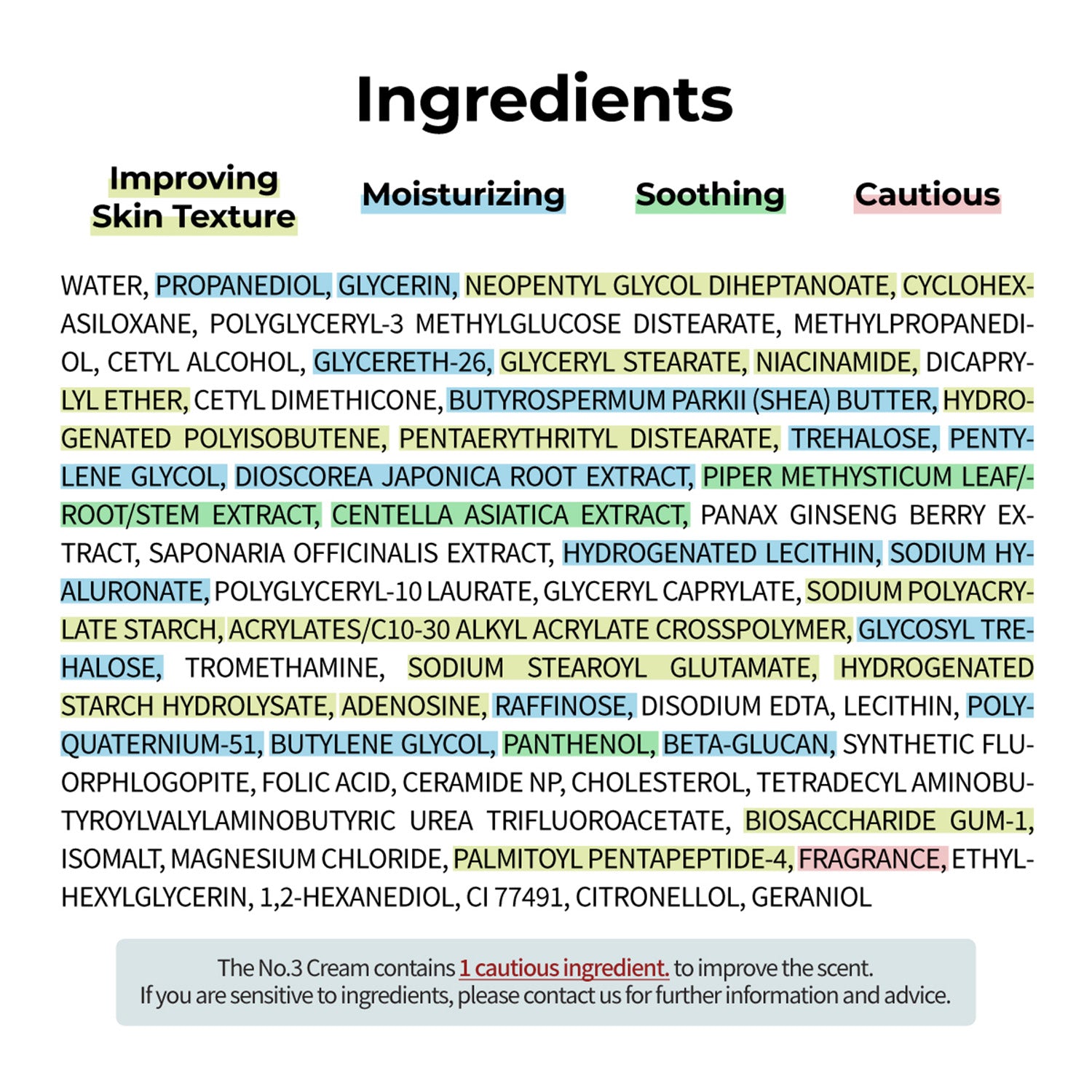 Water, Propanediol, Glycerin, Neopentyl Glycol Diheptanoate, Cyclohexasiloxane, Polyglyceryl-3 Methylglucose Distearate, Methylpropanediol, Cetyl Alcohol Glycereth-26, Glyceryl Stearate, Niacinamide, Dicaprylyl Ether, Cetyl Dimethicone, Butyrospermum Parkii (Shea) Butter, Hydrogenated Polyisobutene, Pentaerythrityl Distearate, Trehalose, Pentylene Glycol Dioscorea Japonica Root Extract, Piper Methysticum Leaf/root/stem Extract, Centella Asiatica Extract, Panax Ginseng Berry Extract, Saponaria Officinalis Extract, Hydrogenated Lecithin, Sodium Hyaluronate, Polyglyceryl-10 Laurate, Glyceryl Caprylate, Sodium Polyacrylate Starch, Acrylates/C10-30 Alkyl Acrylate Crosspolymer, Glycosyl Trehalose, Tromethamine, Sodium Stearoyl Glutamate, Hydrogenated Starch Hydrolysate, Adenosine, Raffinose, Disodium EDTA, Lecithin, Polyquaternium-51, Butylene Glycol Panthenol, Beta-glucan, Synthetic Fluorphlogopite, Folic Acid, Ceramide NP, Cholesterol, Tetradecyl Aminobutyroylvalylaminobutyric Urea Trifluoroacetate, Biosaccharide Gum-1, Isomalt, Magnesium Chloride, Palmitoyl Pentapeptide-4, Fragrance, Ethylhexylglycerin, 1,2-hexanediol, CI 77491, Citronellol, Geraniol