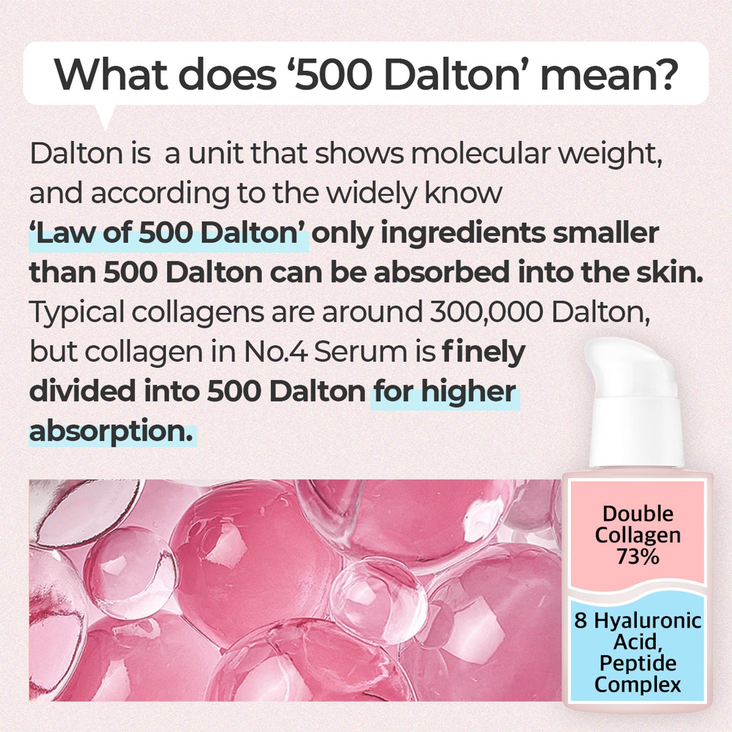 Double Collagen: Delivers 73% Swiss collagen extract and ultra-low molecular 500 Dalton collagen to visibly plump and firm the skin. Hydrolyzed Elastin: Provides structural support to improve skin texture and elasticity.