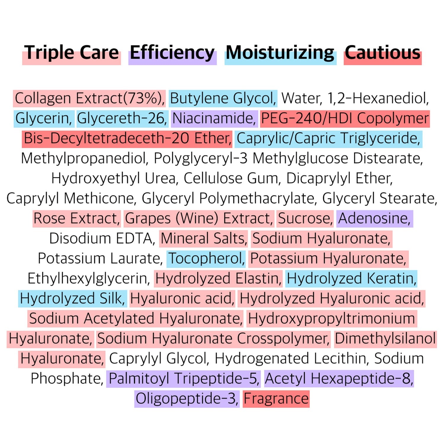 Collagen Extract(73%), Butylene Glycol, Water, 1,2-Hexanediol, Glycerin, Glycereth-26, Niacinamide, PEG-240/HDI Copolymer Bis-Decyltetradeceth-20 Ether, Caprylic/Capric Triglyceride, Methylpropanediol, Polyglyceryl-3 Methylglucose Distearate, Hydroxyethyl Urea, Cellulose Gum, Dicaprylyl Ether, Caprylyl Methicone, Glyceryl Polymethacrylate,Glyceryl Stearate, Rose Extract, Grapes (Wine) Extract, Sucrose, Adenosine, Disodium EDTA, Mineral Salts, Sodium Hyaluronate, Potassium Laurate, Tocopherol, Potassium Hyaluronate, Ethylhexylglycerin, Hydrolyzed Elastin, Hydrolyzed Keratin, Hydrolyzed Silk, Hyaluronic acid, Hydrolyzed Hyaluronic acid, Sodium Acetylated Hyaluronate, Hydroxypropyltrimonium Hyaluronate, Sodium Hyaluronate Crosspolymer, Dimethylsilanol Hyaluronate, Caprylyl Glycol, Hydrogenated Lecithin, Sodium Phosphate,Palmitoyl Tripeptide-5, Acetyl Hexapeptide-8, Oligopeptide-3, Fragrance