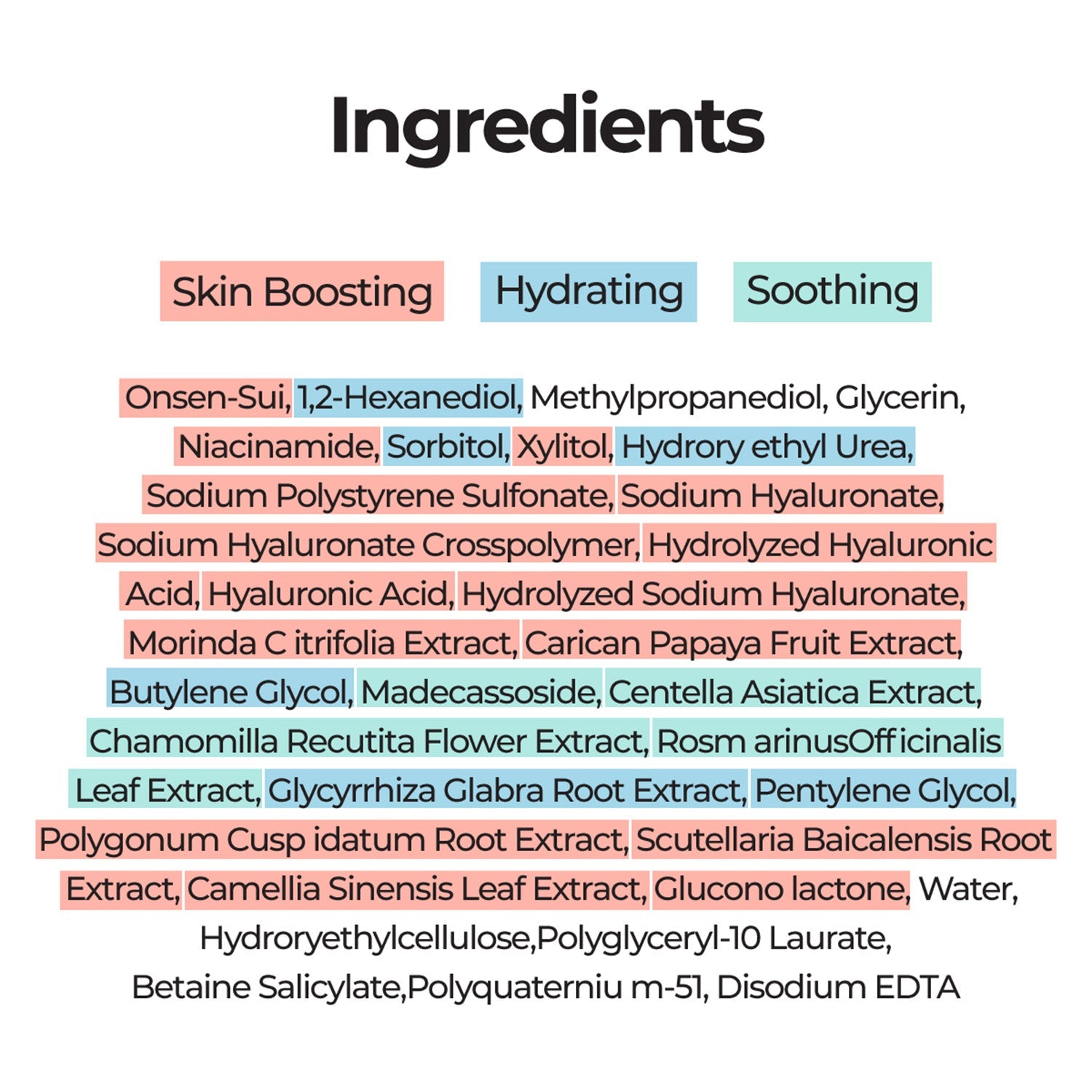 Onsen-Sui (Japanese Hot Spring Water),1,2-Hexanediol, Methylpropanediol, Glycerin, Niacinamide, Sorbitol, Xylitol, Hydroxyethyl Urea, Sodium Polystyrene Sulfonate, Sodium Hyaluronate, Sodium Hyaluronate Crosspolymer, Hydrolyzed Hyaluronic Acid, Hyaluronic Acid, Hydrolyzed Sodium Hyaluronate, Morinda Citrifolia Extract Carica Papaya Fruit Extract, Butylene Glycol, Madecassoside, CentellaAsiatica Extract, Chamomilla Recutita Flower Extract, Rosmarinus Officinalis Leaf Extract, Glycyrrhiza Glabra Root Extract, Pentylene Glycol, PolygonumCuspidatumRoot Extract, Scutellaria Baicalensis Root Extract,Camellia Sinensis Leaf Extract, Gluconolactone, Water, Hydroxyethylcellulose, Polyglyceryl-10 Laurate, Betaine Salicylate, Polyquaternium-51, Disodium EDTA