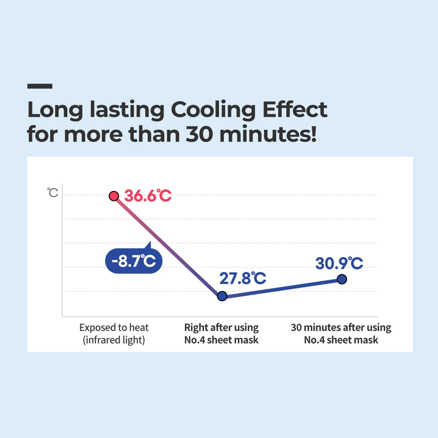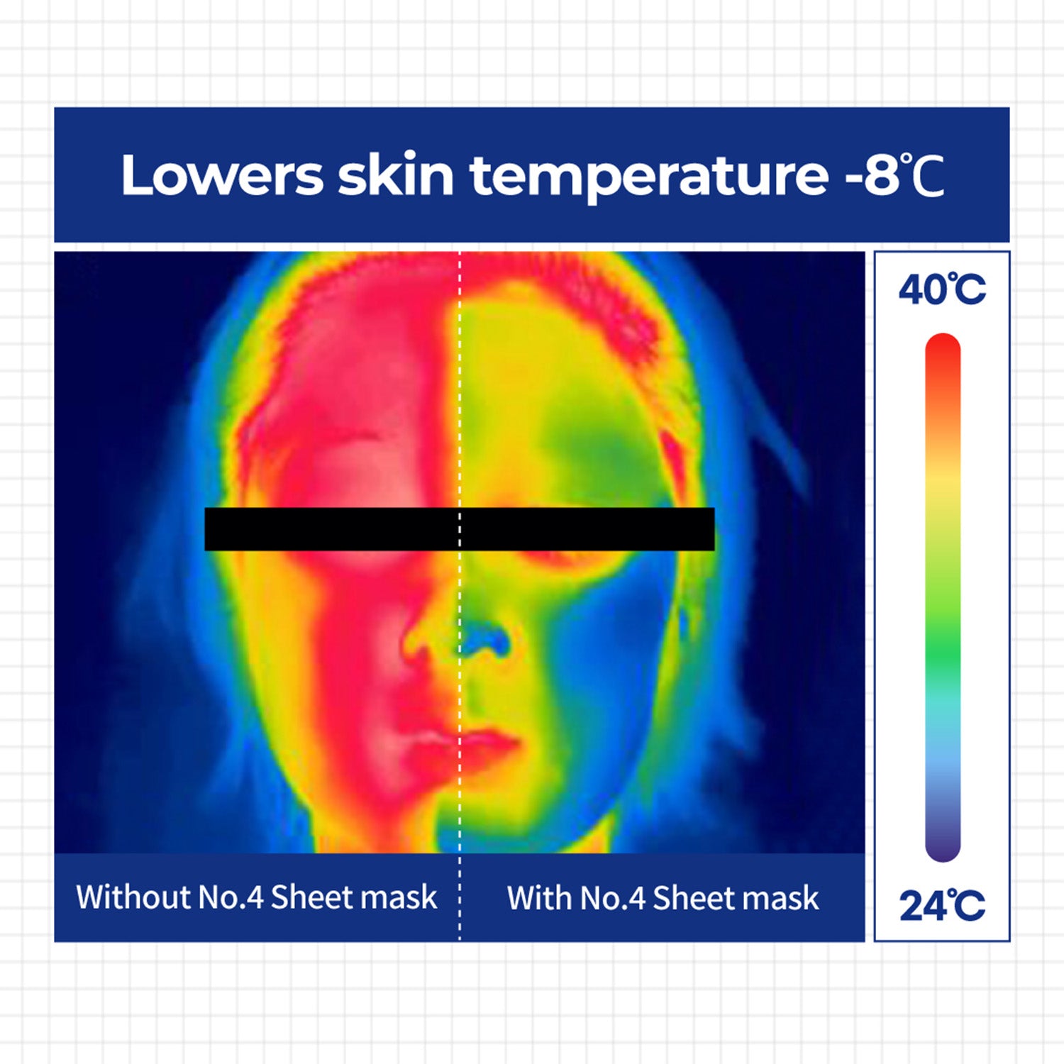 A1: The Numbuzin No.4 Icy Soothing Sheet Mask reduces skin temperature by 8°C and maintains a cooling effect for over 30 minutes. It contains natural extracts like tea tree, bergamot leaf, and ground mugwort, which provide effective soothing and hydration to irritated skin.