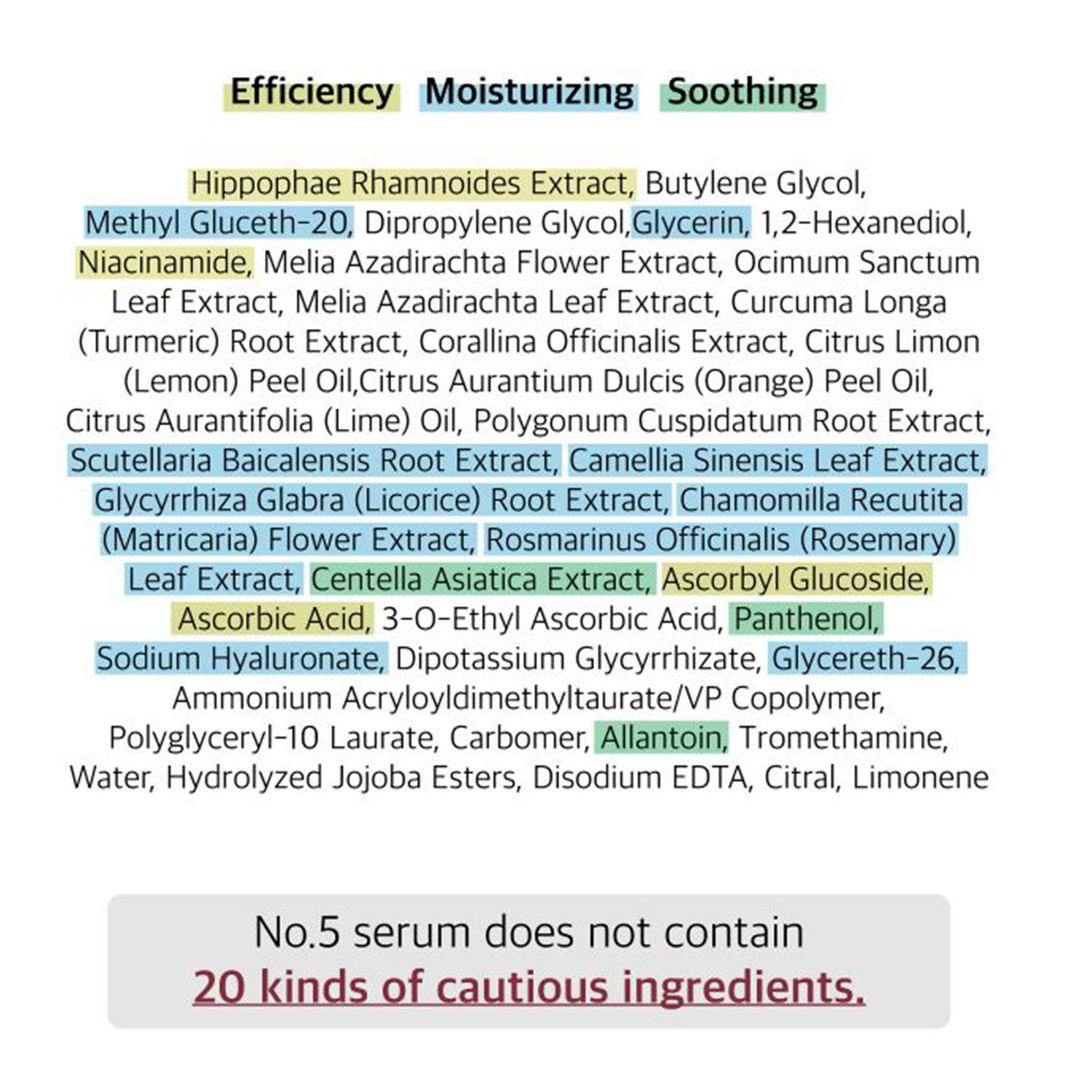 Hippophae Rhamnoides Extract, Butylene Glycol, Methyl Gluceth-20, Dipropylene Glycol, Glycerin, 1,2-Hexanediol, Niacinamide, Melia Azadirachta Flower Extract, Ocimum Sanctum Leaf Extract, Melia Azadirachta Leaf Extract, Curcuma Longa (Turmeric) Root Extract, Corallina Officinalis Extract, Citrus Limon (Lemon) Peel Oil, Citrus Aurantium Dulcis (Orange) Peel Oil, Citrus Aurantifolia (Lime) Oil, Polygonum Cuspidatum Root Extract, Scutellaria Baicalensis Root Extract, Camellia Sinensis Leaf Extract, Glycyrrhiza Glabra (Licorice) Root Extract, Chamomilla Recutita (Matricaria) Flower Extract, Rosmarinus Officinalis (Rosemary) Leaf Extract, Centella Asiatica Extract, Ascorbyl Glucoside, Ascorbic Acid, 3-O-Ethyl Ascorbic Acid, Panthenol, Sodium Hyaluronate, Dipotassium Glycyrrhizate, Glycereth-26, Ammonium Acryloyldimethyltaurate/VP Copolymer, Polyglyceryl-10 Laurate, Carbomer, Allantoin, Tromethamine, Purified Water, Hydrolyzed Jojoba Esters, Disodium EDTA, Citral, Limonene