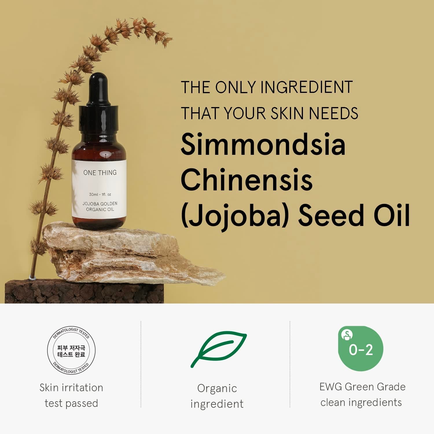 The ONE THING Jojoba Golden Organic Oil focuses on strengthening a damaged skin barrier, reducing sensitivity and rosacea. It is extracted from 100% organically grown Jojoba seeds using an unrefined, cold press method. This method of extraction at low temperatures is best to yield oil with unique golden color and beneficial nutrients intact Without chemical refining process, it shows unique golden in color. Chemical additives free 100% intact healthy oil.