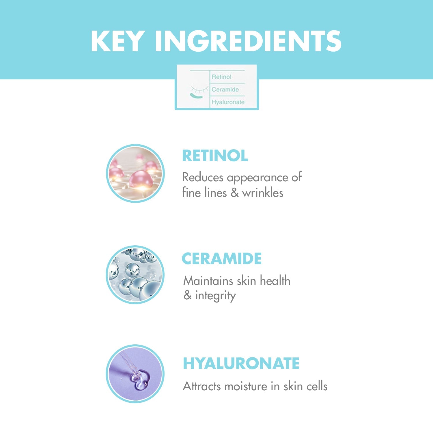 It uses Retinol to fight the appearance of wrinkles around the eye area. It is specially formulated to be gentle and safe for use around the delicate eye area. Retinol helps boosts skin elasticity to visibly firms skin and reduce the appearance of fine lines. It also uses Hyaluronic Acid and Ceramide that hydrate and lock in moisture to keep skin looking plump and firm.