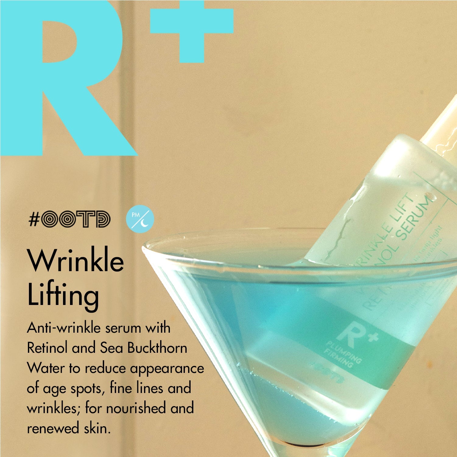 The OOTD Wrinkle Lift Retinol Serum (R+) is a potent anti-wrinkle serum infused with Retinol (Retinyl Palmitate) and Vitamin Tree water to diminish age spots and minimize the appearance of fine lines and wrinkles.