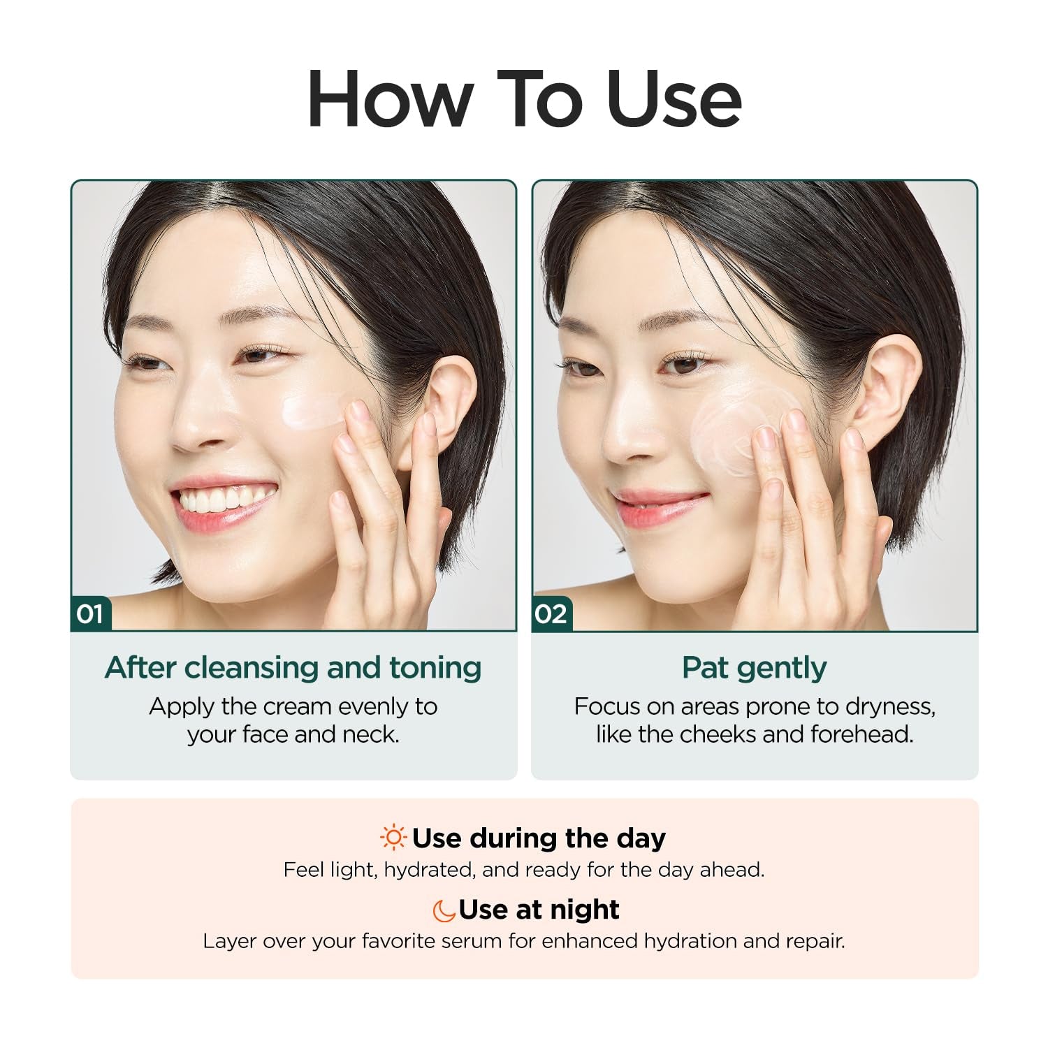 1. After cleansing and toning, apply the cream evenly to your face and neck.