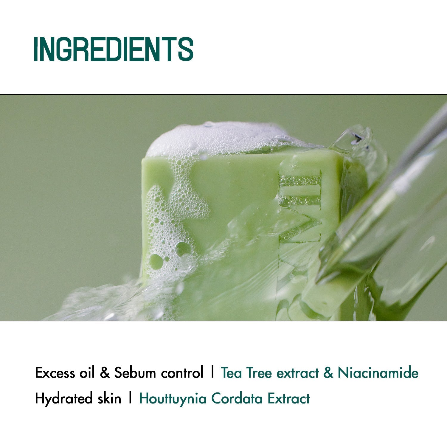 Lauric Acid, Sodium Stearate, Saponified Palm Oil, Sodium Laurate, Sodium Myristate, Stearic Acid, Glycerin, Sorbitol, Lauramidopropyl Betaine, Sodium Hyaluronate, Niacinamide, Chlorella Vulgaris (Dermochlorella Algae) Powder, Triticum Vulgare (Wheat) Sprout Powder, Melaleuca Alternifolia (Tea Tree) Extract, Houttuynia Cordata Extract, Glycyrrhiza Glabra (Licorice) Root Extract, Leontopodium Alpinum (Edelweiss) Extract, Olea Europaea (Olive) Fruit Oil, Argania Spinosa (Argan) Oil, Camellia Sinensis (Green Tea) Seed Oil, Hydrolyzed Adansonia Digitata (Baobab) Extract, Salix Alba (White Willow) Bark Extract, Centella Asiatica (Gotu Kola) Extract, Pyrus Malus (Apple) Fruit Extract, Citrus Limon (Lemon) Fruit Extract, Citrus Aurantium Dulcis (Orange) Fruit Extract, Betula Platyphylla Japonica Bark Extract, Hydrolyzed Potato Protein, Hydrolyzed Wheat Protein, Hydrolyzed Rice Protein, Hydrolyzed Oat Protein, Lactobionic Acid, Melaleuca Alternifolia (Tea Tree) Leaf Oil, Tetrasodium EDTA