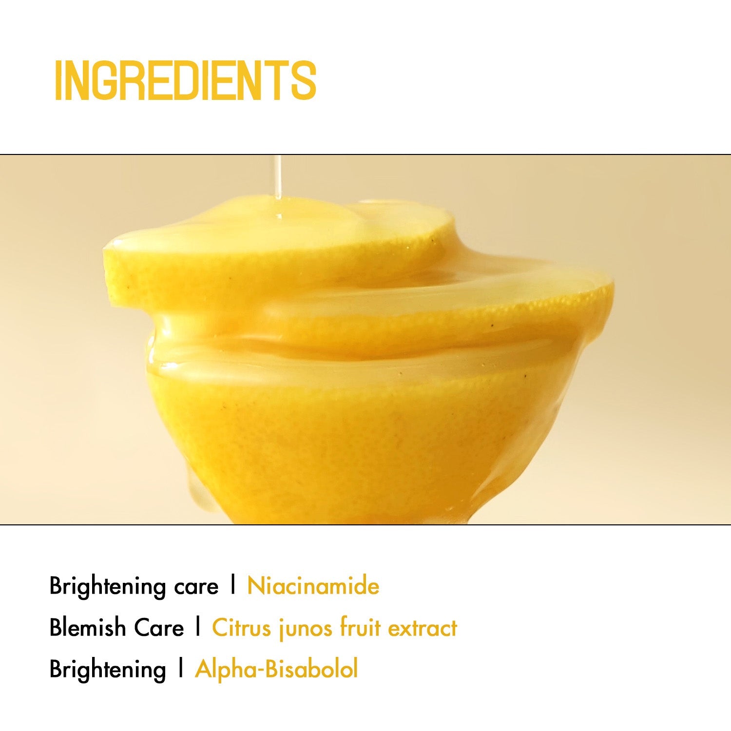 Citrus Junos Fruit Extract [83%], Niacinamide [10%], Caprylic/Capric Triglyceride, 1,2-Hexanediol, Hydrogenated Poly(C6-14 Olefin), Alpha-Bisabolol, Carbomer, Arginine, Brassica Campestris (rapeseed) Seed Oil, Xanthan Gum, Ethylhexylglycerin, Adenosine, Citrus Junos Peel Oil [293.1 ppm], Melia Azadirachta Flower Extract, Ocimum Sanctum Leaf Extract, Glycyrrhiza Glabra (Licorice) Root Extract, Polyglyceryl-3 Diisostearate, Melia Azadirachta Flower Extract, Distilled Water, Curcuma Longa Root Extract, Corallina Officinalis Extract, Glycerin, Butylene Glycol, Althaea Officinalis Root Extract, Oryza Sativa (Rice) Bran Extract, 3-0-Ethyl Ascorbic Acid, Hydrogenated Lecithin, Ficus Carica(Fig) Fruit Extract, Punica granatum fruit Ext., Morus Alba Fruit Extract, Ginkgo biloba leaf extract, Tocopherols, Polyglyceryl-10 Stearate, Panthenol, Sodium Ascorbyl Phosphate, Biotin, Folic Acid, Pyridoxine, Cyanocobalamin, Linoleic acid, Riboflavin, Beta-Carotene, Inositol, Thiamine HCL, Disodium EDTA, Limonene, Linalool