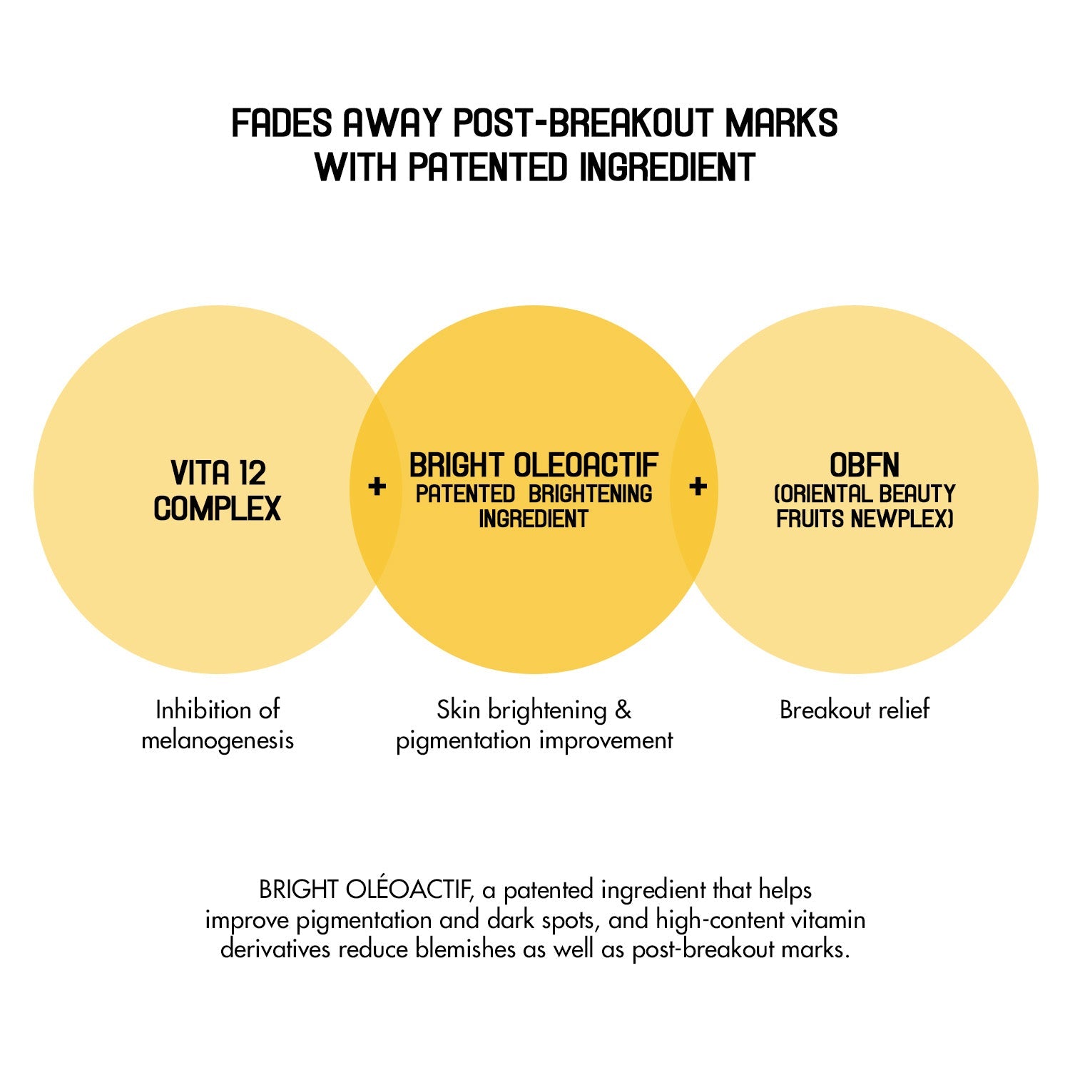 Bright Oleoactif: A patented brightening ingredient, that improves skin tone, reduces blemishes and pigmentation.