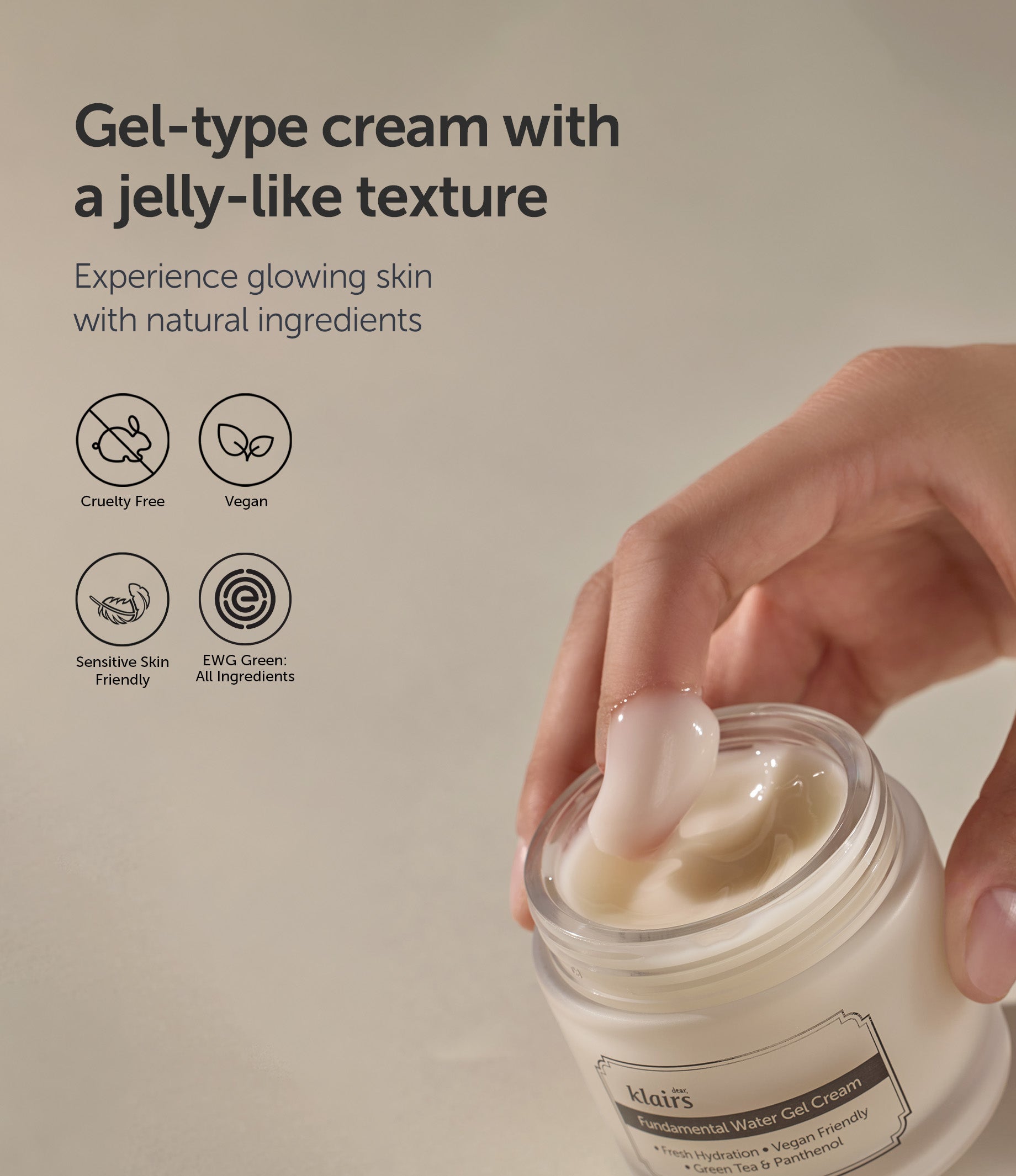 - Klairs Fundamental Water Gel Cream hydrates skin and penetrates to deeper layers for moisturization. It has a light, non-greasy, and non-sticky texture, perfect for summer.