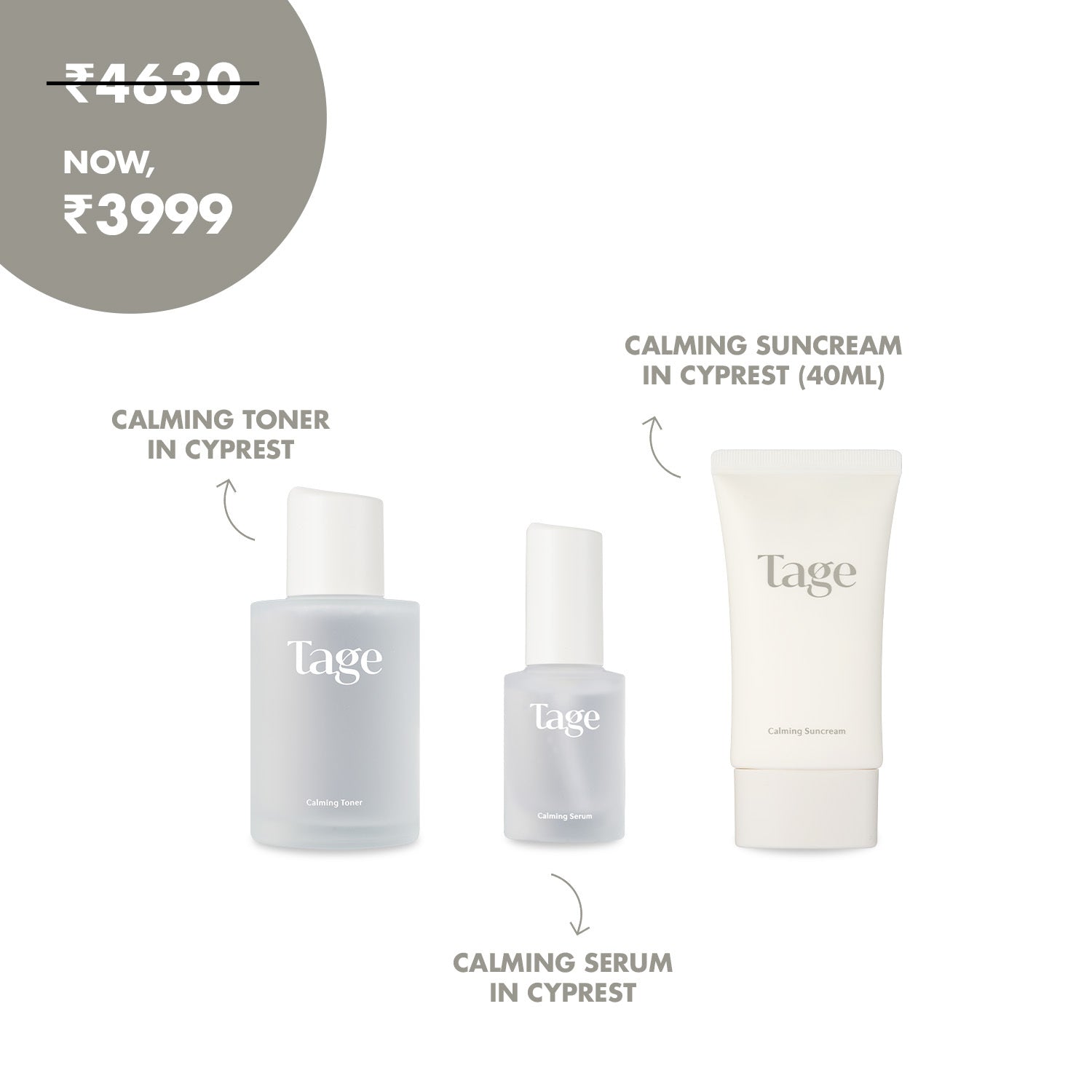 Cypress Infused Skincare for Calm, Healthy, and Balanced Skin. The kit includes all 3 calming products from Tage - Tage Calming Toner in Cyprest, Tage Calming Serum in Cyprest, and the Tage Calming Suncream in Cyprest.