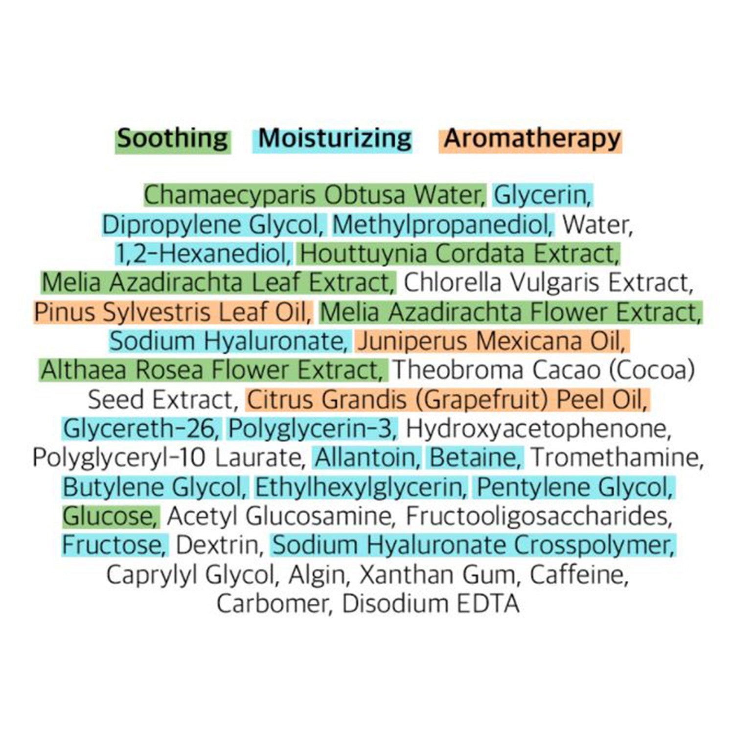 Cypress Water (81%), Glycerin, Dipropylene Glycol, Methylpropanediol, Purified Water, 1,2-Hexanediol, Yakushi Extract (1000 Ppm), Indian Mulberry Leaf Extract, Chlorella Vulgaris Extract, Guzo Tree Leaf Oil, Indian Mulberry Flower Extract, Sodium Hyaluronate, Mexican Juniper Oil, Hollyhock Extract, Cacao Seed Extract, Tangerine Peel Oil, Glycereth-26, Polyglycerin-3, Hydroxyacetophenone, Polyglyceryl-10 Laurate, Allantoin, Betaine, Tromethamine, Butylene Glycol, Ethylhexylglycerin, Pentylene Glycol, Glucose, Acetylglucosamine, Fructooligosaccharide, Fructose, Dextrin, Sodium Hyaluronate Crosspolymer , Caprylyl Glycol, Algin, Xanthan Gum, Caffeine, Carbomer, Disodium EDTA