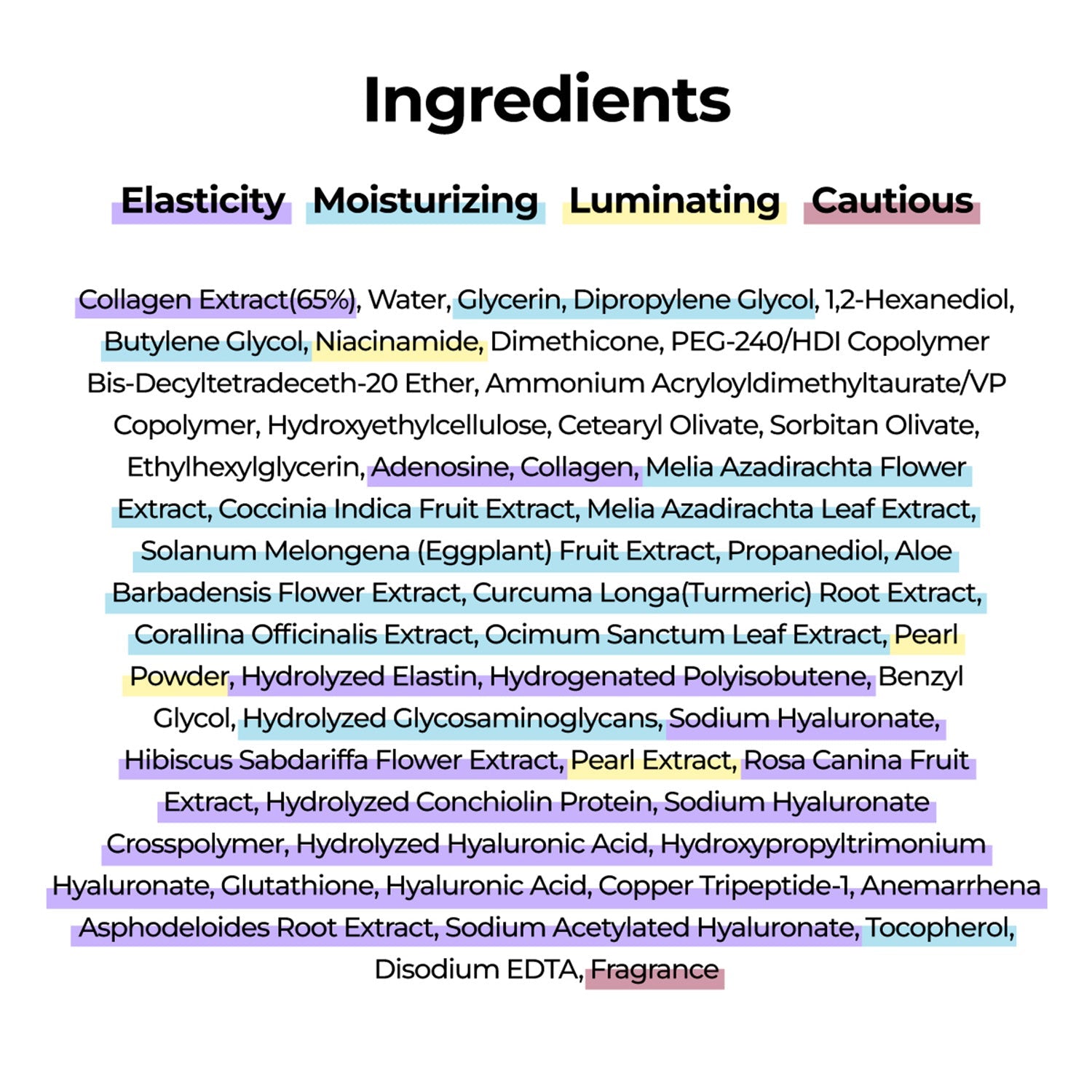 Collagen Extract(65%), Water, Glycerin, Dipropylene Glycol, 1,2-Hexanediol, Butylene Glycol, Niacinamide, Dimethicone, PEG-240/HDI Copolymer Bis-Decyltetradeceth-20 Ether, Ammonium Acryloyldimethyltaurate/VP Copolymer, Hydroxyethylcellulose, Cetearyl Olivate, Sorbitan Olivate, Ethylhexylglycerin, Adenosine, Collagen, Melia Azadirachta Flower Extract, Coccinia Indica Fruit Extract, Melia Azadirachta Leaf Extract, Solanum Melongena (Eggplant) Fruit Extract, Propanediol, Aloe Barbadensis Flower Extract, Curcuma Longa (Turmeric) Root Extract, Corallina Officinalis Extract, Ocimum Sanctum Leaf Extract, Pearl Powder, Hydrolyzed Elastin, Hydrogenated Polyisobutene, Benzyl Glycol, Hydrolyzed Glycosaminoglycans, Sodium Hyaluronate, Hibiscus Sabdariffa Flower Extract, Pearl Extract, Rosa Canina Fruit Extract, Hydrolyzed Conchiolin Protein, Sodium Hyaluronate Crosspolymer, Hydrolyzed Hyaluronic Acid, Hydroxypropyltrimonium Hyaluronate, Glutathione, Hyaluronic Acid, Copper Tripeptide-1, Anemarrhena Asphodeloides Root Extract, Sodium Acetylated Hyaluronate, Tocopherol, Disodium EDTA, Fragrance